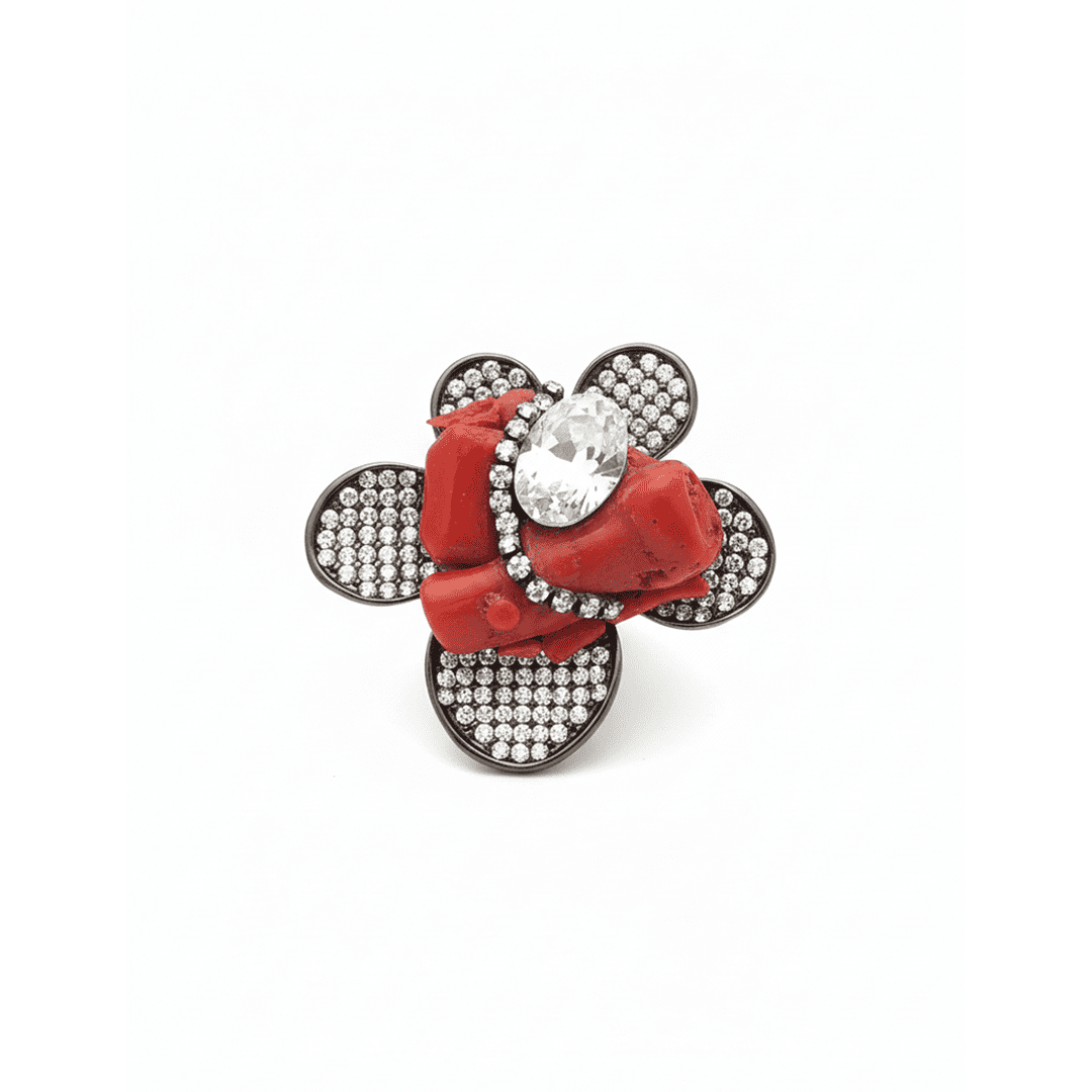 Questo anello a fiore corallo è pensato per non passare inosservato. Il suo design è un grande fiore tridimensionale, i cui petali sono realizzati con Corallo Bambù dal colore rosso intenso. Al centro del bocciolo, un cluster di zirconi bianchi e grigi crea un pistillo scintillante che cattura la luce, mentre piccoli cristalli aggiungono ulteriori punti di brillantezza.