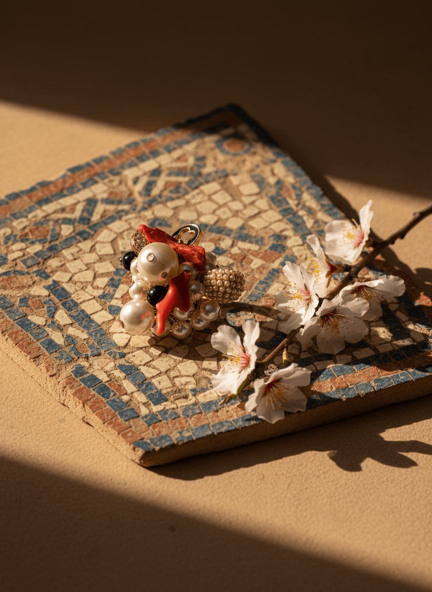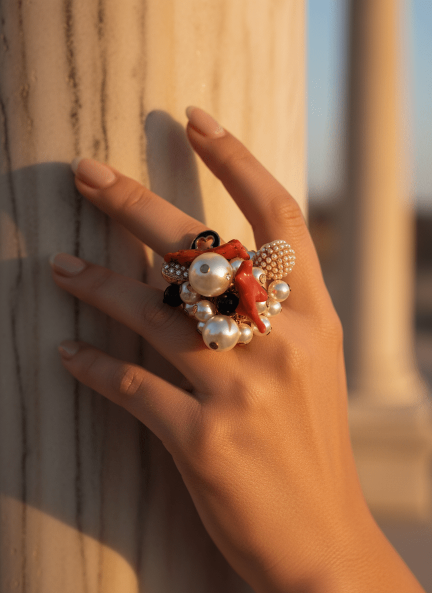 Il nostro anello corallo perle e onice non è un semplice accessorio, ma un’affermazione di stile, un’opera d’arte in miniatura che racchiude l’anima più opulenta e passionale del Mediterraneo. L’ispirazione è quella di un tesoro riemerso dagli abissi, un cluster di gemme e creature marine incastonate dal tempo.