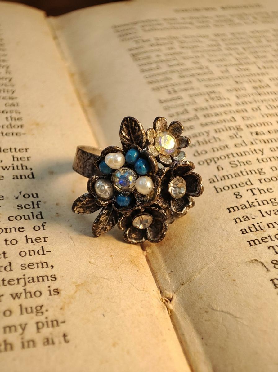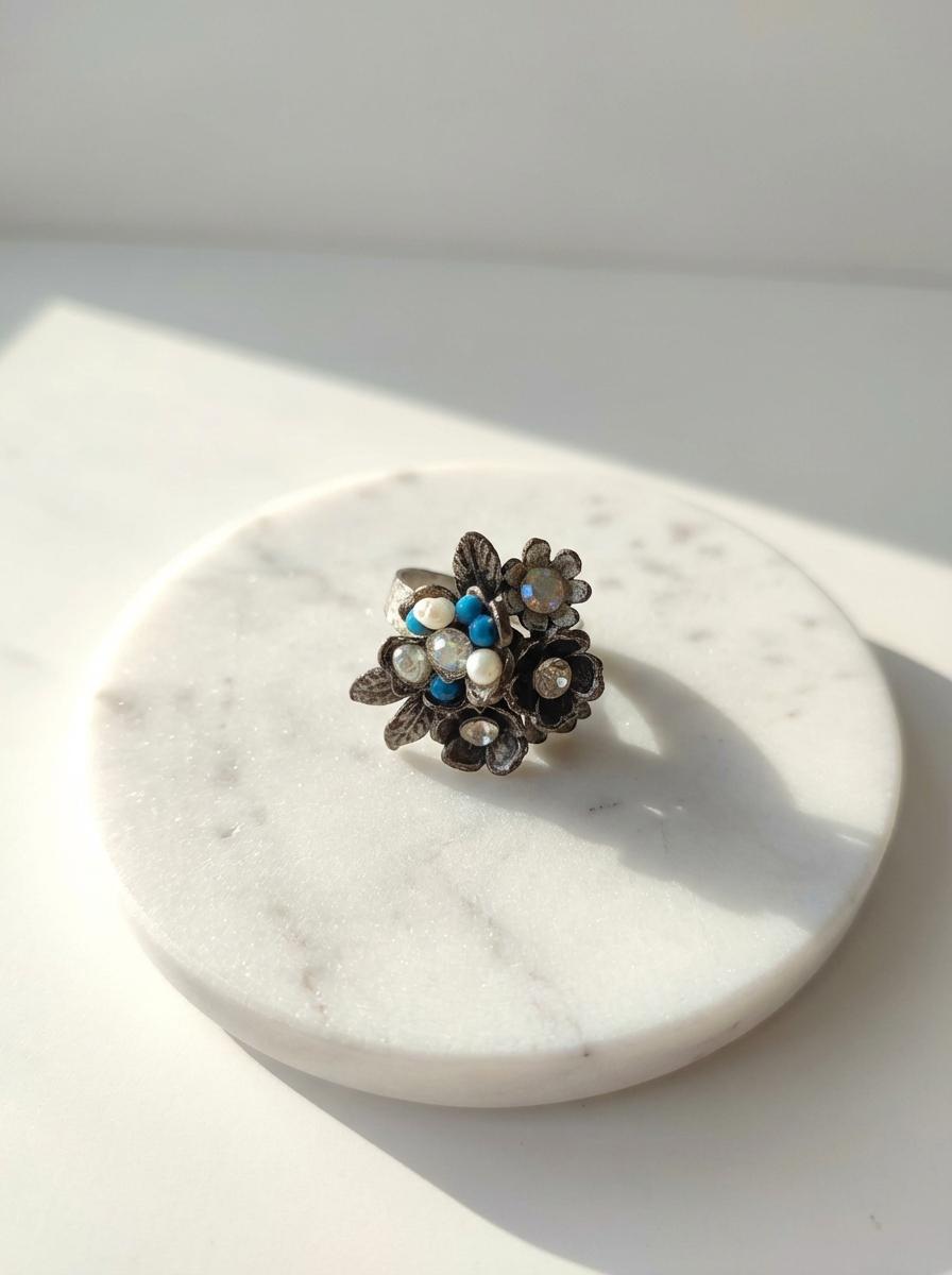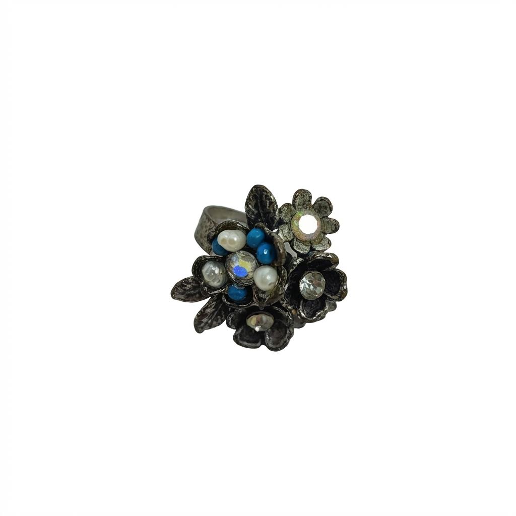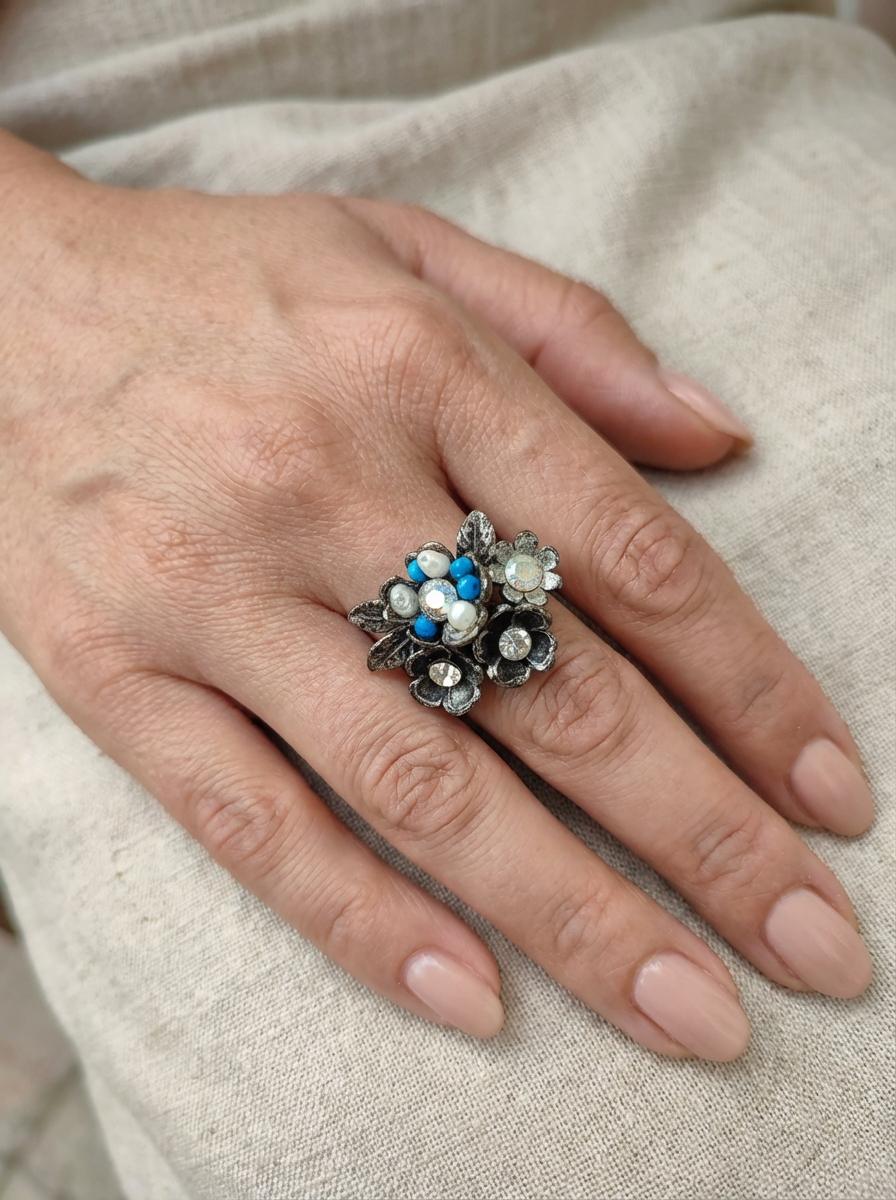 Questo anello porta un piccolo bouquet sempre con te. Realizzato in Zama con finitura argento antico, presenta una composizione di fiorellini in metallo impreziositi da cristalli luminosi e piccoli tocchi di blu e bianco perla. È l’accessorio ‘scacciapensieri’ ideale: economico, robusto e versatile.