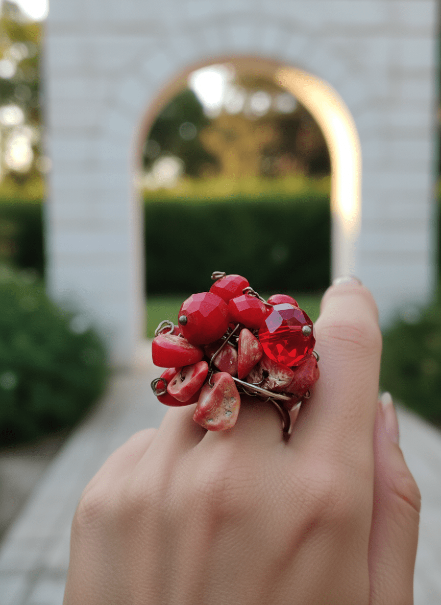 La sua struttura è un ricco e opulento grappolo dove si mescolano pezzi di corallo bambù, con la sua texture naturale, e cristalli rossi sfaccettati che catturano e riflettono la luce come lapilli incandescenti. Ogni elemento è assemblato a mano per creare un bouquet tridimensionale che veste la mano in modo unico e spettacolare. La base regolabile lo rende comodo e versatile, perfetto per ogni dito. Questo anello corallo rosso e cristalli è più di un accessorio: è un amuleto di vitalità, un tocco di colore audace per chi non ha paura di mostrare la propria fiamma interiore.