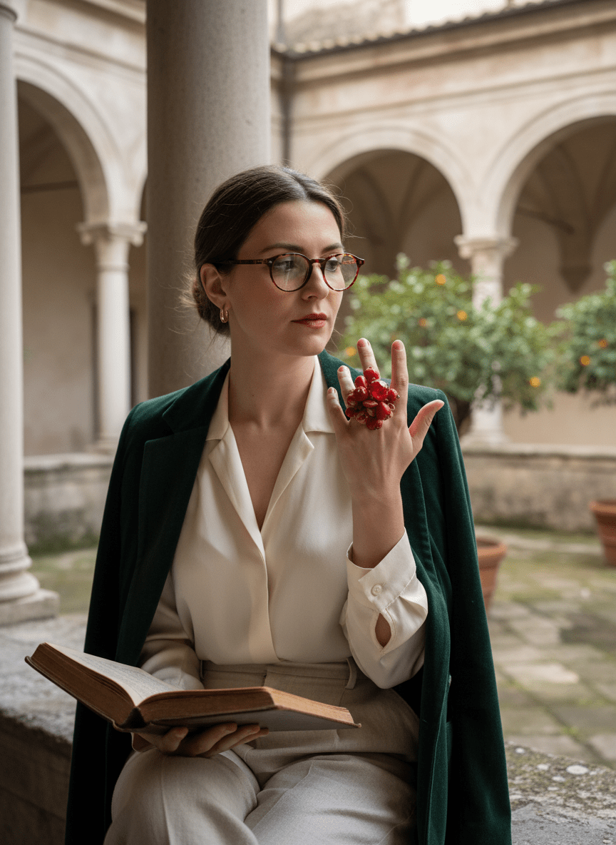 Il nostro anello corallo rosso e cristalli è pura energia mediterranea, un gioiello che cattura l’essenza di un vulcano che incontra il mare. È un pezzo scultoreo e audace, pensato non per essere semplicemente indossato, ma per essere vissuto, per raccontare una storia di forza e passione.