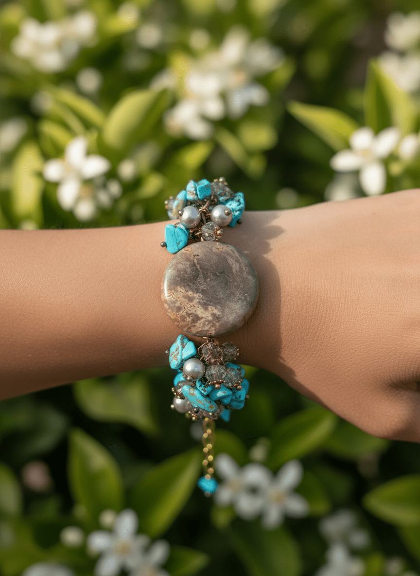 Un gioiello che racchiude la forza primordiale della terra e il colore vibrante del mare. Questo bracciale turchese e pietra naturale è un pezzo unico, un capolavoro di opulenza e stile per la donna che non ama passare inosservata.