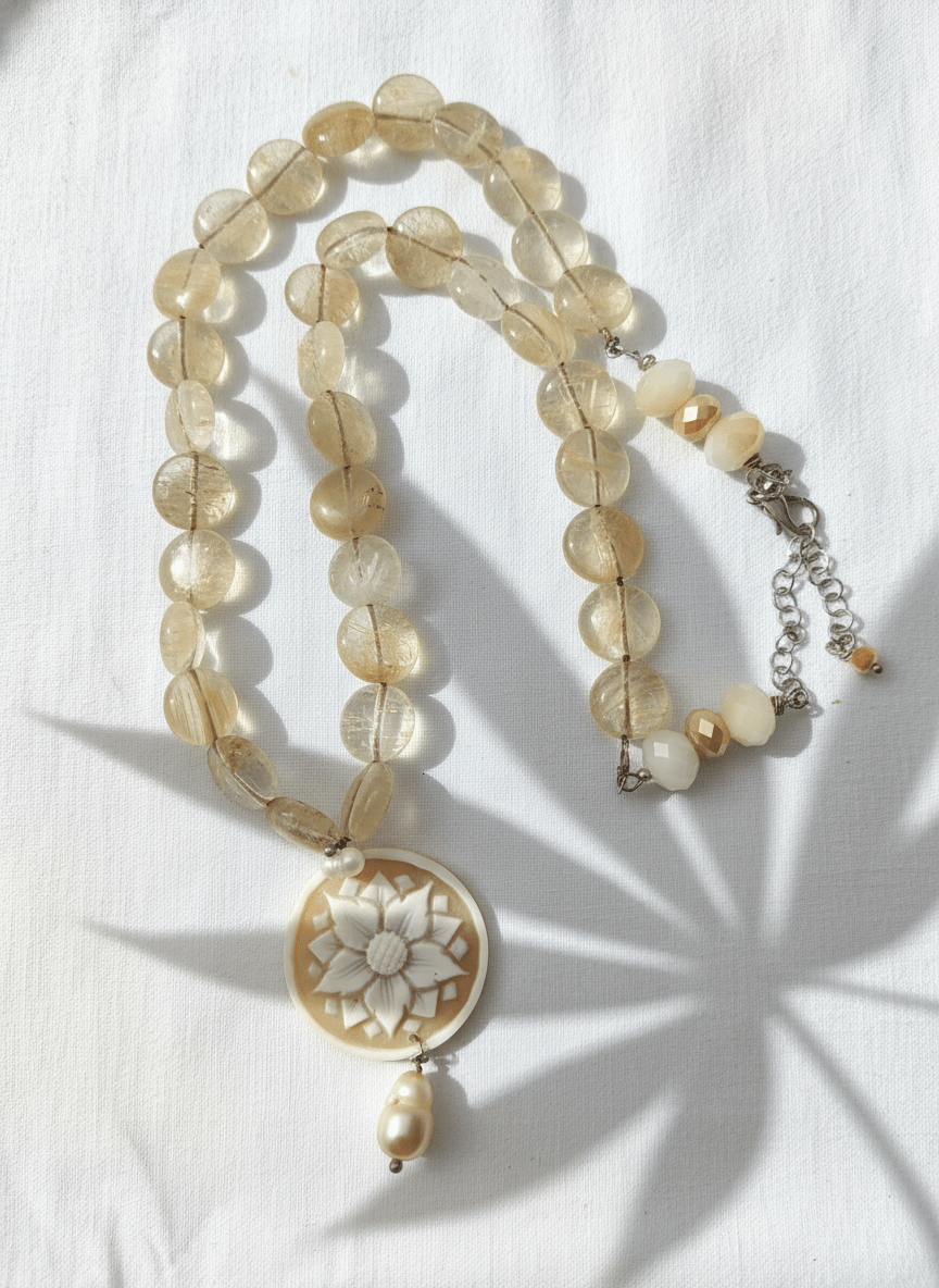Un giardino segreto da indossare. Questa collana agata e cammeo è un gioiello unico che unisce i colori caldi della terra (l’agata citrino), la delicatezza di un cammeo floreale e la luce di una perla barocca.