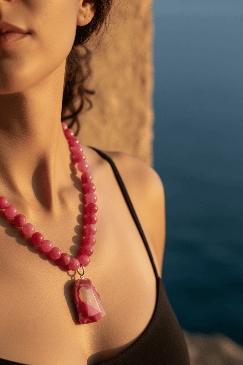 - Materiali: Agata Fucsia (10 mm), Ciondolo in Agata Maculata (40 x 25 mm).
