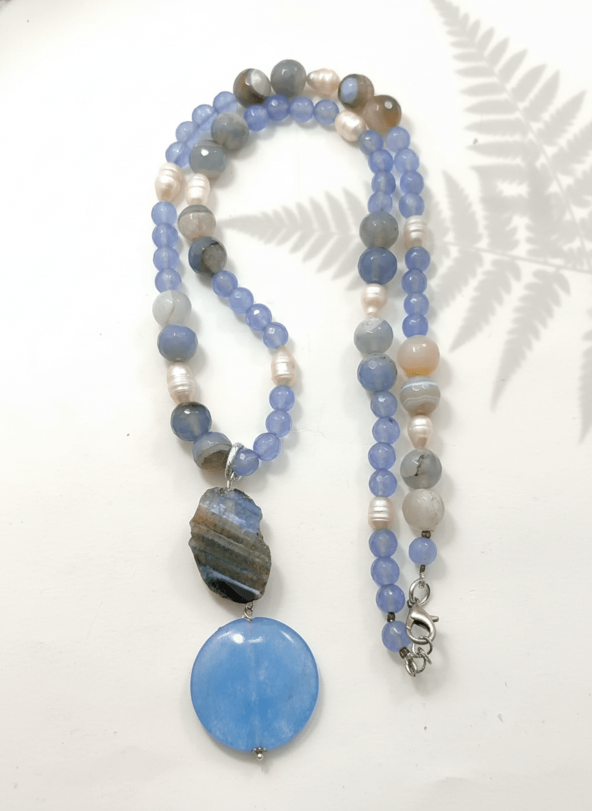 Materiali: Azzurrite, Perle di Fiume, Agata Blu Maculata, Moschettone in Zama