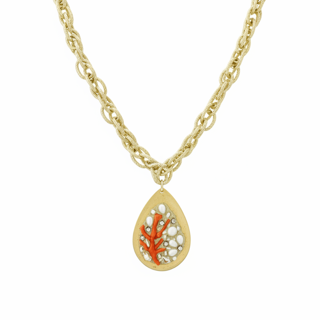 Questa collana ciondolo corallo è un gioiello che nasce da una tecnica che amo molto, quella dell’inclusione in resina. All’interno di questo ciondolo ho creato una composizione unica, come un piccolo tesoro sommerso, utilizzando frammenti di vero corallo rosso, perline e piccoli zirconi che aggiungono un tocco di luce.
