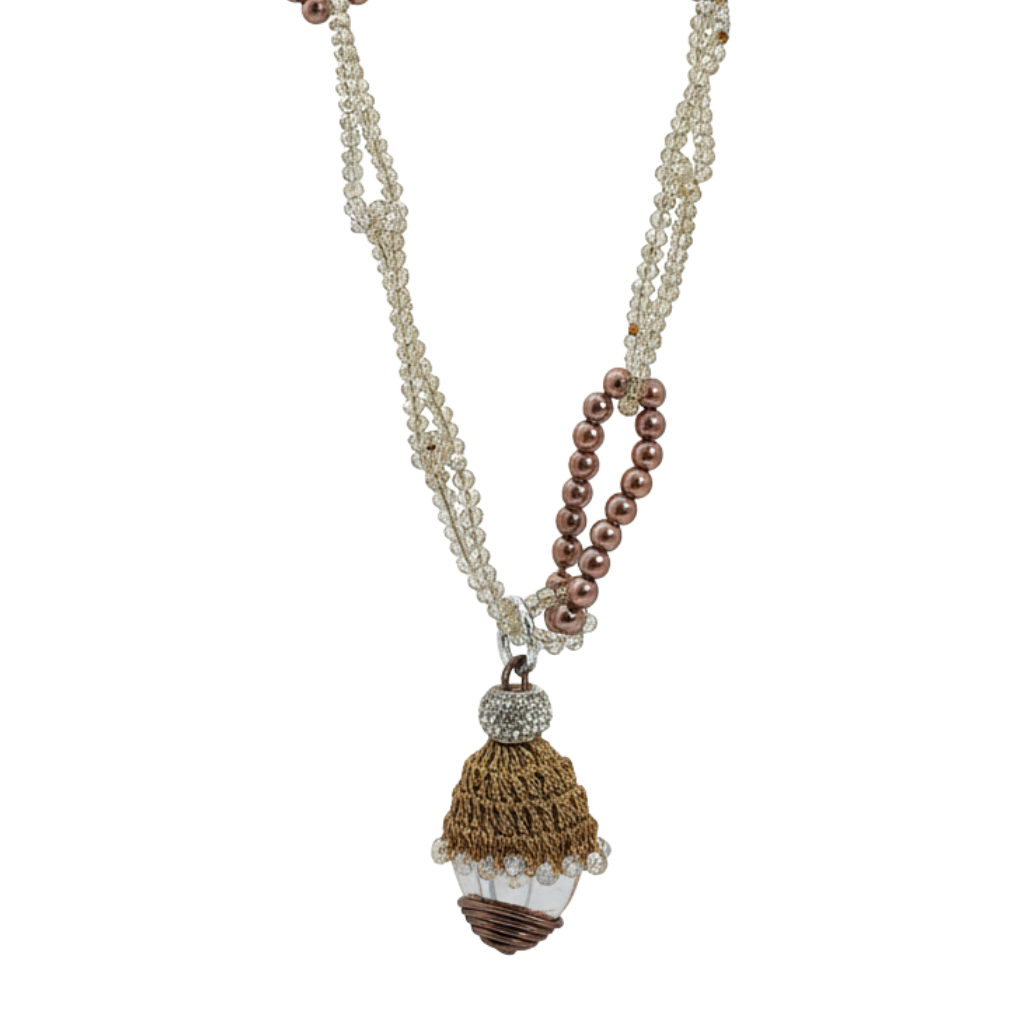 Un gioiello da favola. Questa collana con ciondolo all’uncinetto è un capolavoro di artigianato, che unisce la luce dei cristalli al calore delle perle e all’unicità di una lavorazione artistica. Eleganza esotica e senza tempo.