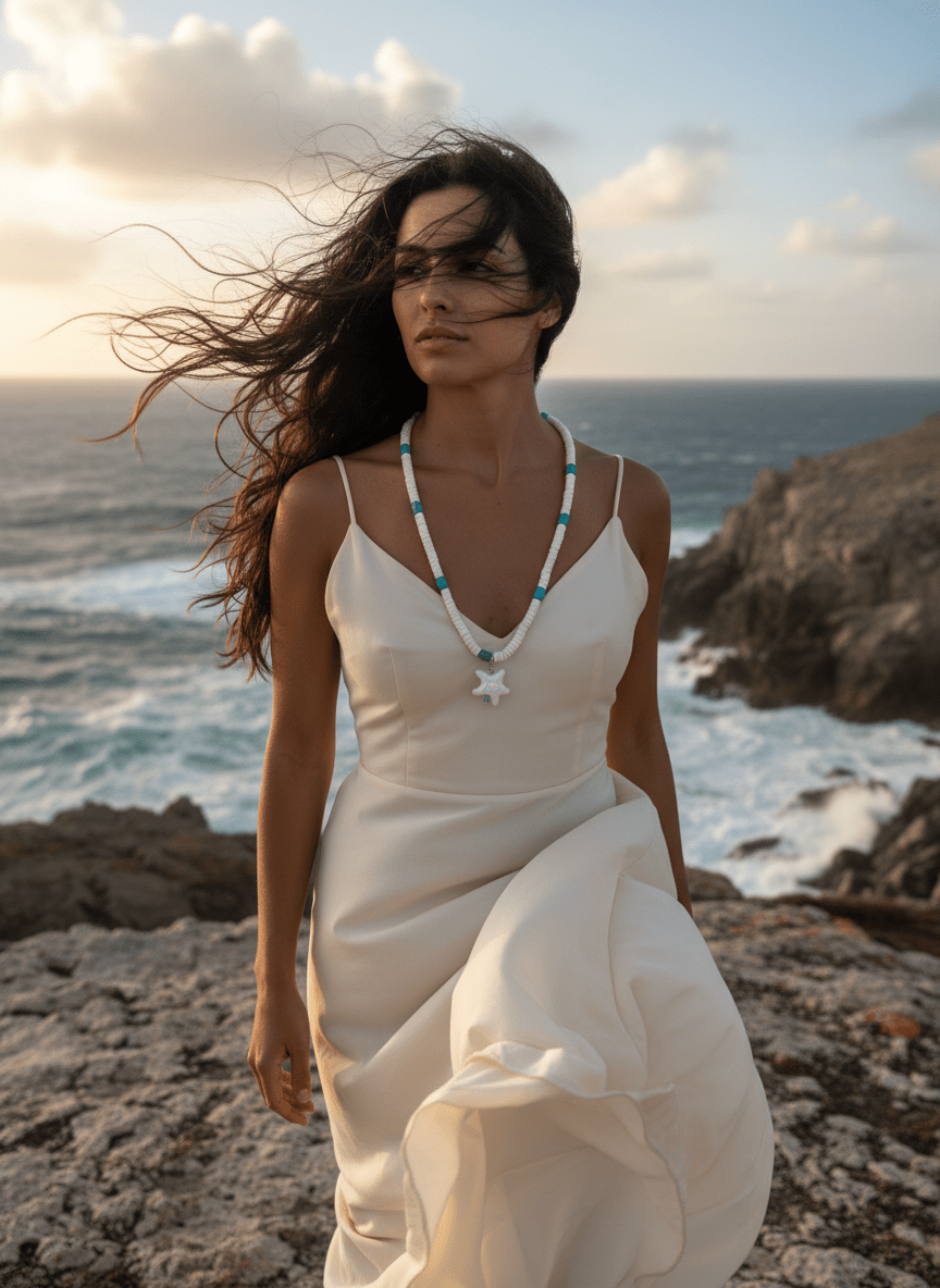 Questa collana con stella è un invito a sognare le vacanze e il mare. L’abbiamo creata alternando pietre di onice bianco a inserti di turchese, una combinazione di colori che evoca immediatamente le spiagge bianche e le acque cristalline del Mediterraneo.