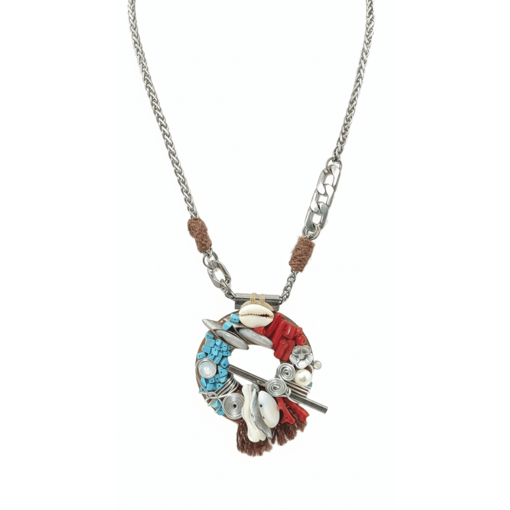 Il design è studiato per valorizzare questo incontro cromatico, con un ciondolo che funge da cuore pulsante del gioiello. Questa collana corallo e turchese è un classico intramontabile, un amuleto di protezione e gioia perfetto per l’estate e non solo.