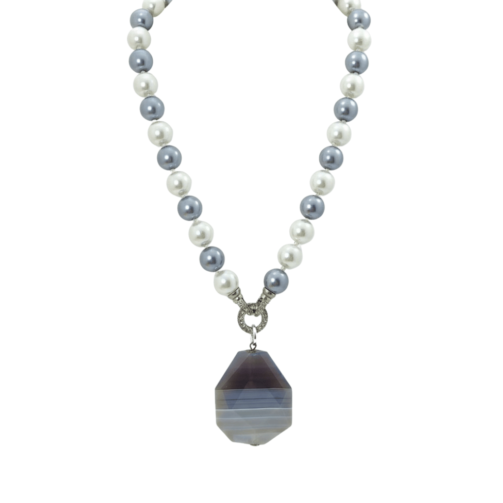 Il design gioca su un’armoniosa alternanza di perle luminose: la purezza delle perle bianche si sposa con le sofisticate sfumature delle perle grigio perla, creando una base cromatica neutra e incredibilmente chic. A collegare le perle al pendente, un prezioso anello tempestato di zirconi scintillanti funge da punto luce. Il protagonista assoluto è il magnifico ciondolo in Agata a fasce, un capolavoro della natura la cui superficie sfaccettata rivela strati di colore che vanno dal grigio fumo al bianco latte.