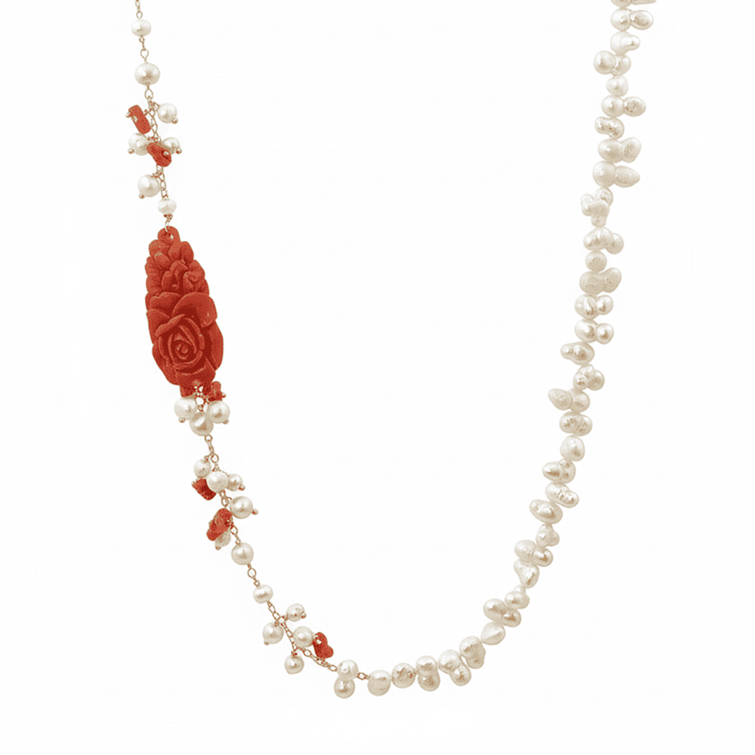 Il design classico è interrotto da un punto focale audace: un ciondolo rosso, creato artigianalmente con perline di fiume e frammenti di corallo originale. Questo dettaglio colorato aggiunge un tocco di carattere e vitalità, rendendo la collana di perle con ciondolo un accessorio perfetto per ogni occasione, da un evento formale a un aperitivo estivo.