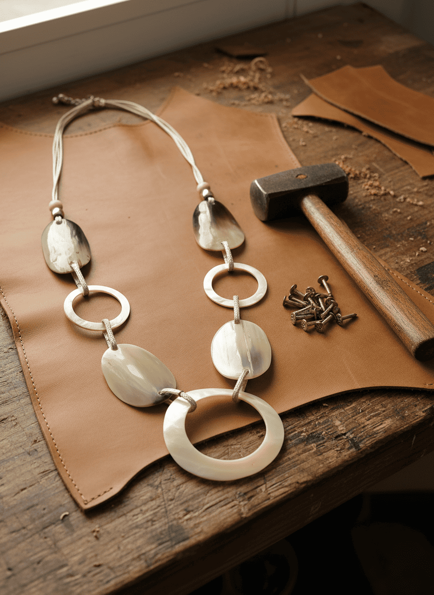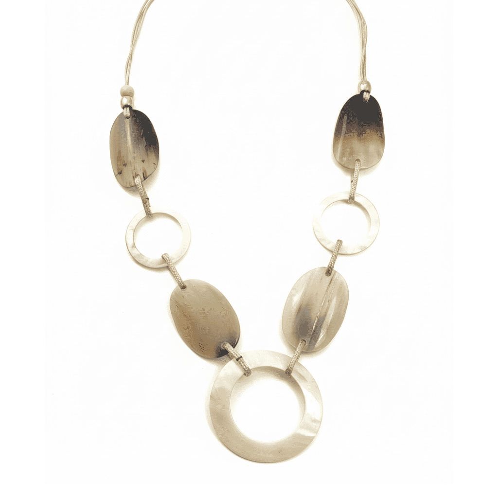 Un gioiello che parla il linguaggio della natura. Questa collana lunga in corno originale è un pezzo unico e audace, dove le sfumature calde del corno e i riflessi cangianti della madreperla si fondono in un design dal forte sapore etnico-chic.