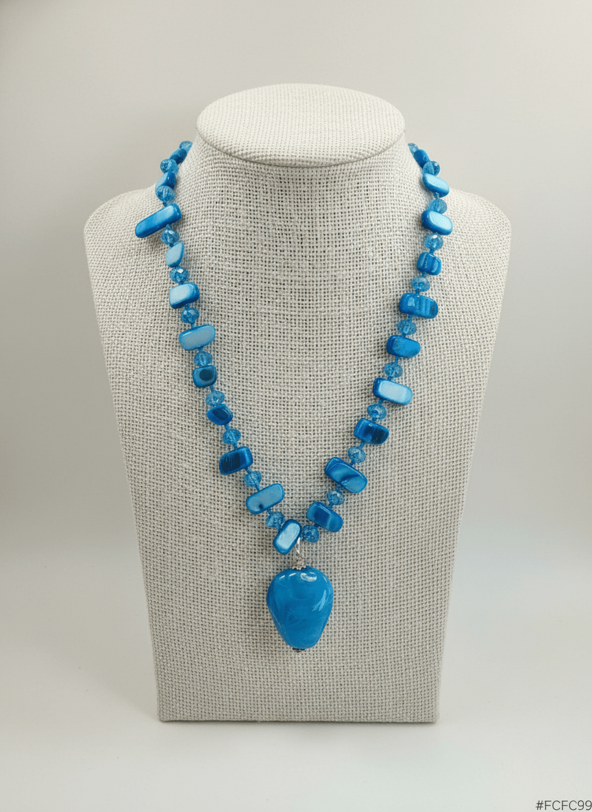 Questa collana madreperla e turchese è un omaggio ai colori del Mediterraneo. L’abbiamo realizzata alternando la luce iridescente della madreperla a inserti di cristalli color turchese, creando un gioco di riflessi che ricorda l’acqua cristallina baciata dal sole.