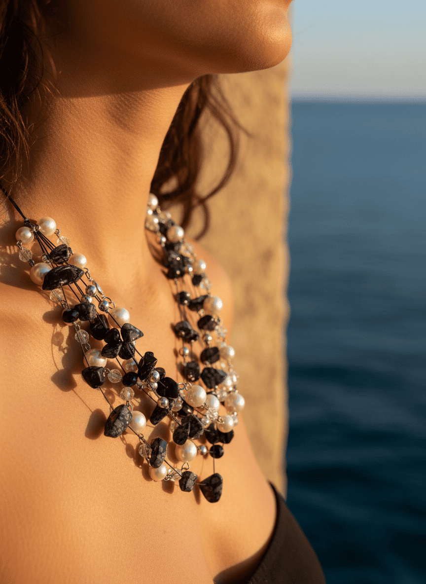 Questa collana multifilo pietre naturali è un accessorio pensato per essere un passe-partout di stile. Il suo design è un delicato intreccio di più fili, ognuno impreziosito da un mix di materiali diversi: la luminosità delle perle, i riflessi dei mezzi cristalli e le texture uniche delle pietre naturali.