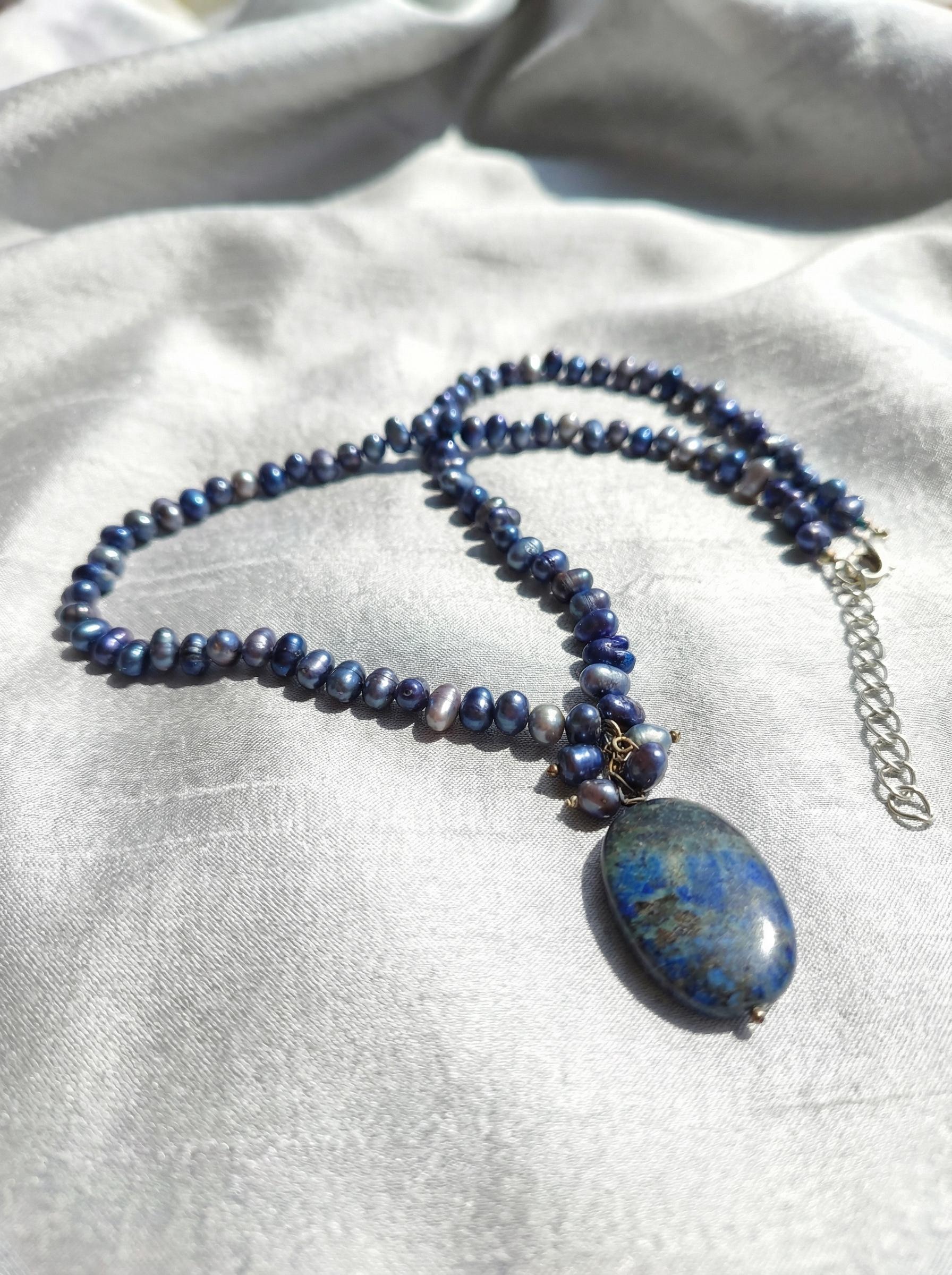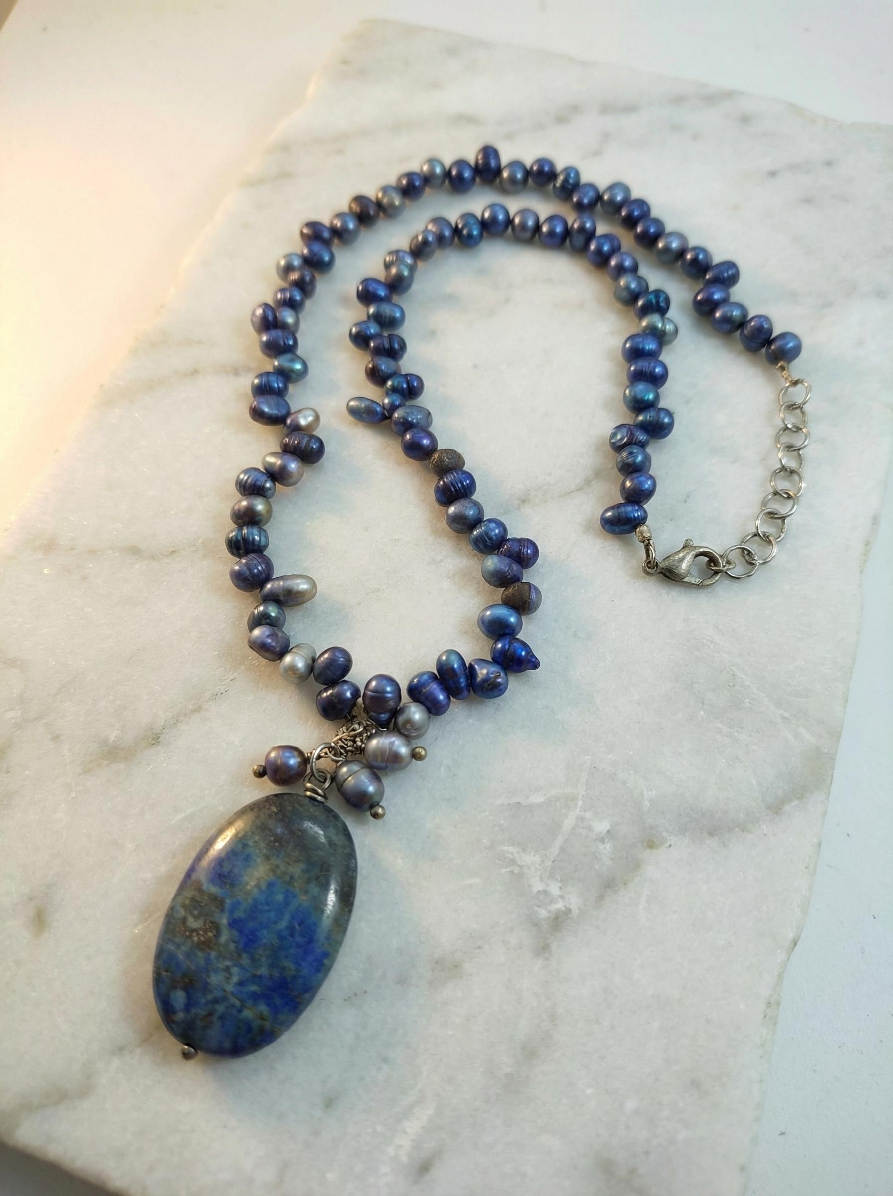 Un cielo stellato da indossare. Questa collana perle blu unisce la lucentezza delle perle di fiume (tinte in un blu profondo sfumato) alla maestosità di un ciondolo in Lapislazzuli.