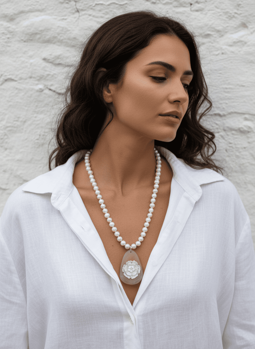 • Materiali: Perle di Fiume Barocche (10/12 mm), Ciondolo in Onice (Agata, 5 cm), Cammeo Sardonico Floreale Originale (3×3 cm).