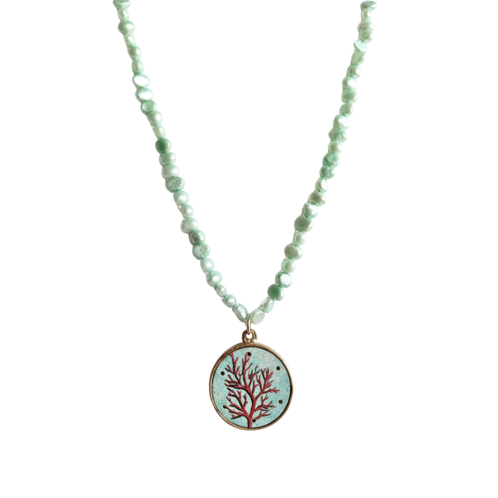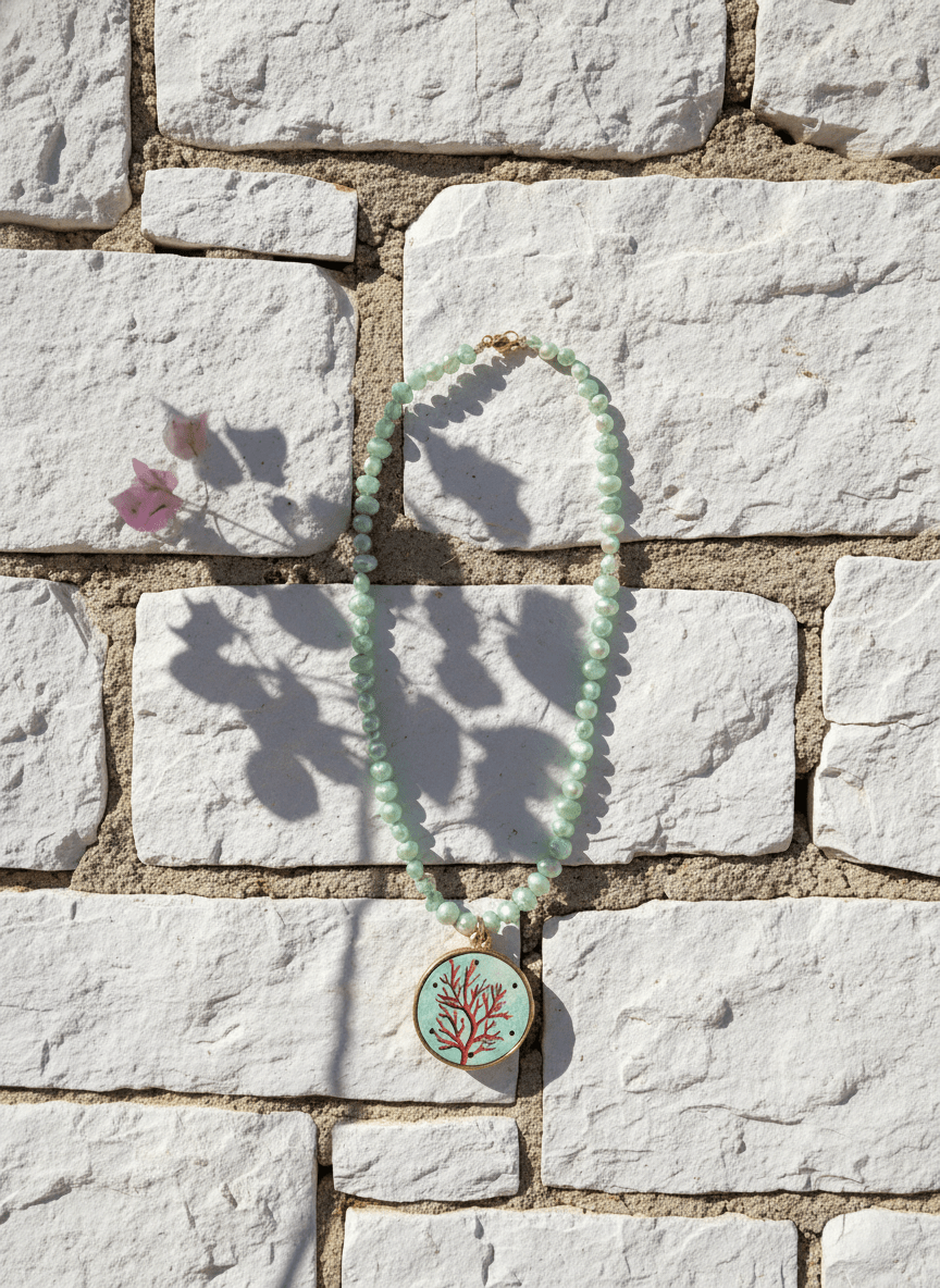 Il cuore del gioiello è il ciondolo (3×3 cm): una base in Zama finemente dipinta a mano con un motivo che raffigura il corallo, rendendo ogni pezzo un’opera d’arte irripetibile. Indossare questa collana perle e corallo significa scegliere un accessorio che parla di creatività e amore per i dettagli unici.
