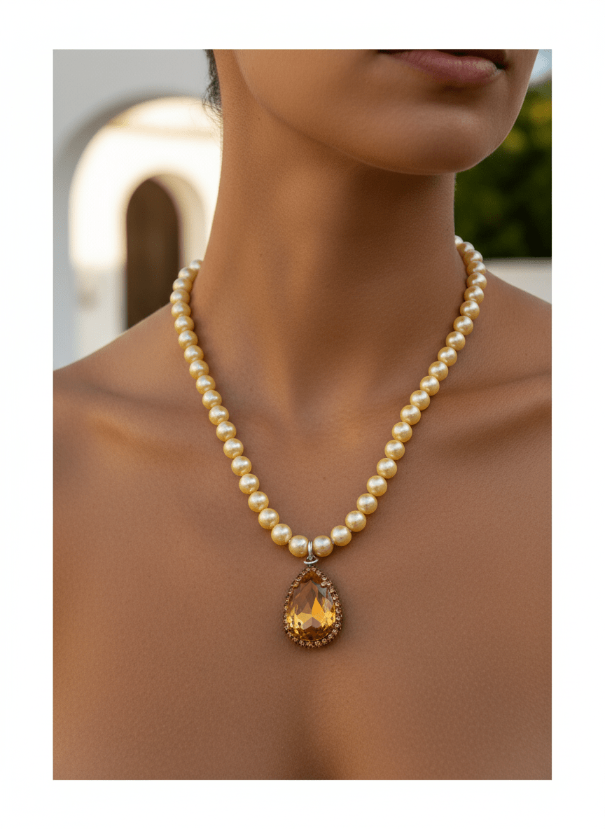 Un raggio di sole da indossare. Questa collana perle gialle e cristallo è un gioiello che cattura la luce dell’estate, unendo l’eleganza classica del girocollo di perle alla brillantezza di un ciondolo prezioso e luminoso.