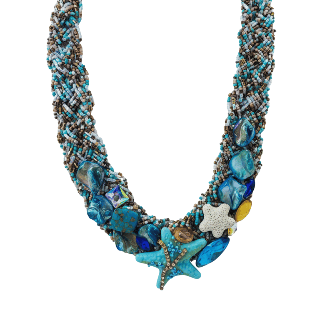 La parte inferiore è un vero e proprio mosaico di elementi naturali: frammenti di Madreperla TurchesePietre Laviche dalla texture unica, vibranti Pietre Turchesi e luminosi Cristalli si fondono con dettagli a forma di stella marina. Ogni materiale è stato scelto con cura per creare una sinfonia di colori e sensazioni al tatto. Indossa questa collana in stile bohémien per aggiungere un tocco di magia sofisticata al tuo stile e lasciati avvolgere dall’energia vibrante dei suoi componenti.