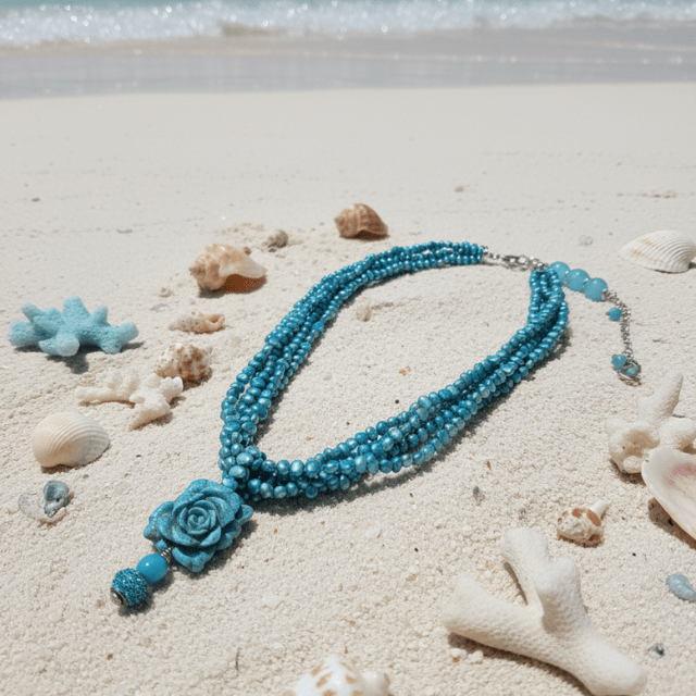 Indossa i colori del mare. Una magnifica collana turchese a più fili, realizzata con perle di fiume azzurre e un ciondolo a rosa scolpito. L’accessorio perfetto per un’estate indimenticabile.