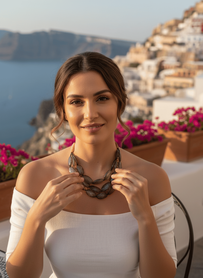 Questa collana multifilo color fumo è un gioiello di carattere, pensato per la donna che ama gli accessori statement che definiscono un look. Ispirata ai colori caldi di un tramonto estivo, è perfetta per una serata elegante o per dare un tocco sofisticato a un outfit da giorno.