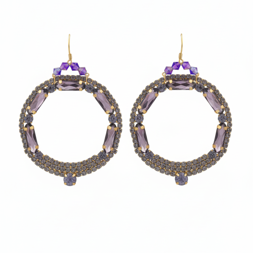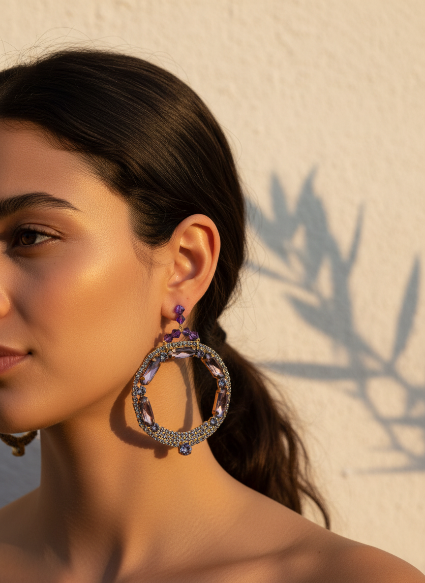 Il design è un grande cerchio completamente rivestito da un pavé di strass e impreziosito da cristalli taglio baguette color ametista, che creano un gioco di riflessi e di luce a 360 gradi. La loro leggerezza li rende sorprendentemente comodi da indossare, nonostante l’impatto visivo importante. Perfetti per una cerimonia, una serata di gala o per trasformare un semplice abito nero in un capolavoro di stile, questi orecchini a cerchio ametista sono pura magia da indossare.