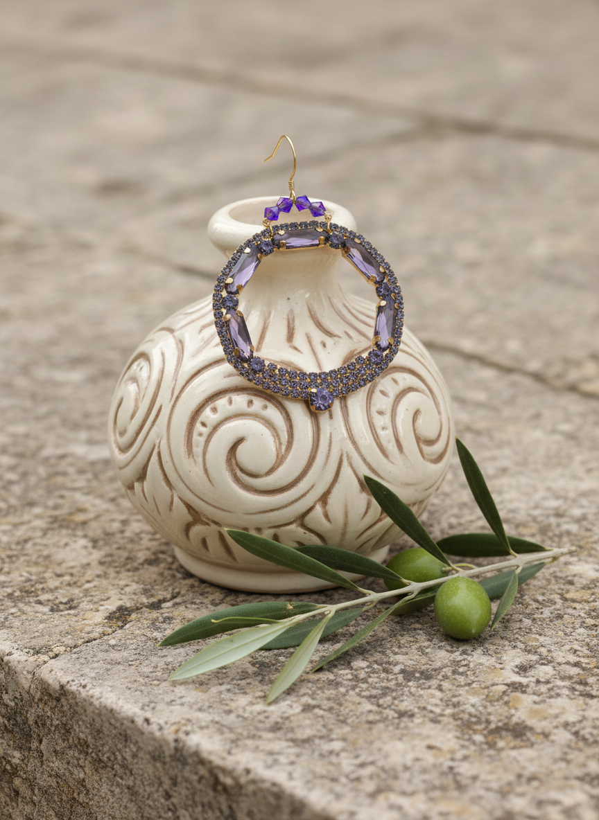 I nostri orecchini a cerchio ametista sono un invito a brillare, un gioiello scenografico pensato per la donna che ama essere protagonista con eleganza e stile. L’ispirazione è quella di una notte stellata, catturata in un accessorio che non passa inosservato.