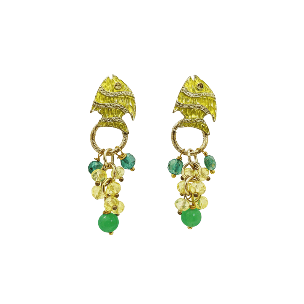 Il design è un piccolo capolavoro di creatività: il perno è un delizioso pesciolino in Zama smaltato in una fresca tonalità verde chiaro. Da esso pende un ricco e luminoso grappolo di cristalli e pietre nelle tonalità del giallo e del verde smeraldo. Nonostante la loro ricchezza, questi orecchini sono sorprendentemente leggeri e confortevoli da indossare tutto il giorno. L’effetto finale è quello di un paio di orecchini a forma di pesce che danzano e brillano ad ogni movimento.