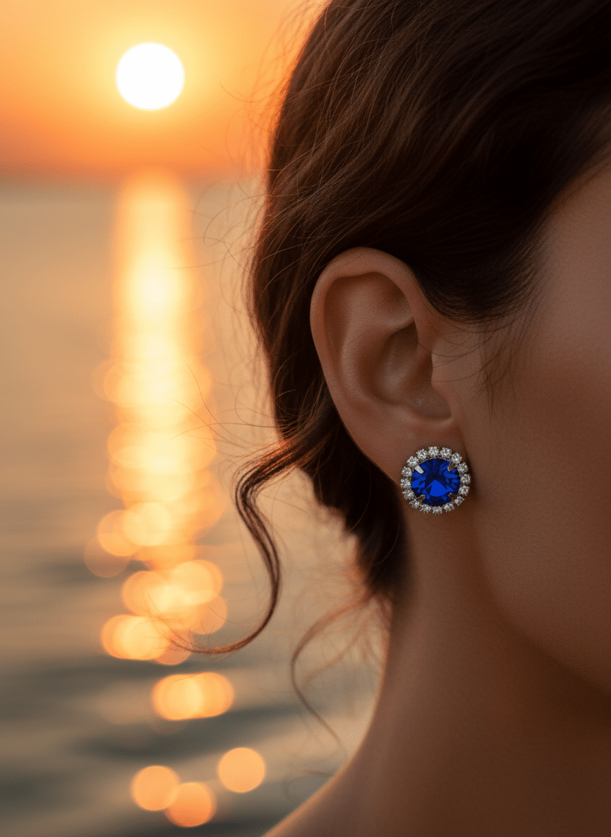 Un punto luce di pura eleganza. Questi orecchini a lobo blu zaffiro sono un classico intramontabile, con un brillante cristallo centrale incorniciato da zirconi scintillanti. Perfetti per ogni occasione.