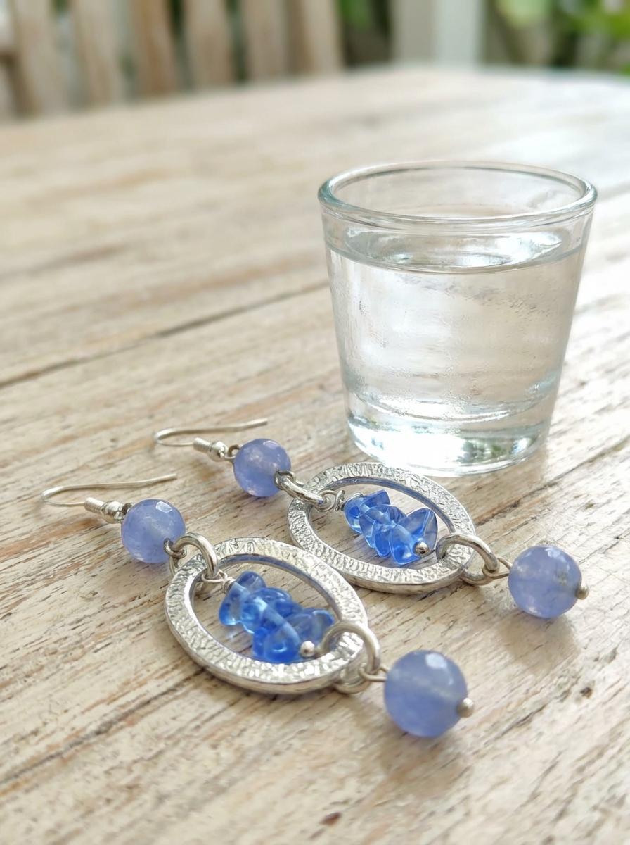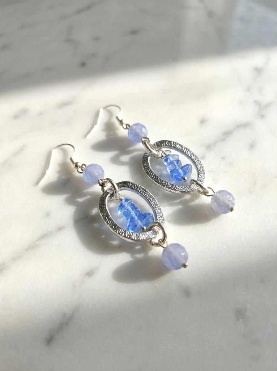 Questi orecchini catturano le sfumature del cielo e del mare in un design fresco e versatile. Le pietre di Agata blu sfaccettata donano una luce delicata al viso, incorniciate da un cerchio in Zama martellata che aggiunge un tocco moderno e artigianale alla composizione.