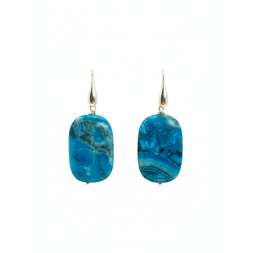 Ogni orecchino è un capolavoro irripetibile della natura. La grande pietra di Agata maculata (3×2 cm) è un microcosmo di sfumature che vanno dal turchese profondo all’azzurro cielo, con venature e striature che rendono ogni pezzo diverso dall’altro. La monachella in Argento Rodiato, un trattamento prezioso che garantisce massima brillantezza e resistenza, completa un design semplice e perfetto, che lascia tutta la scena alla bellezza della pietra. Questi orecchini in agata blu mare sono l’accessorio ideale per un look estivo e chic.