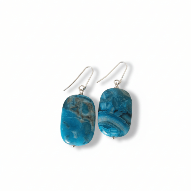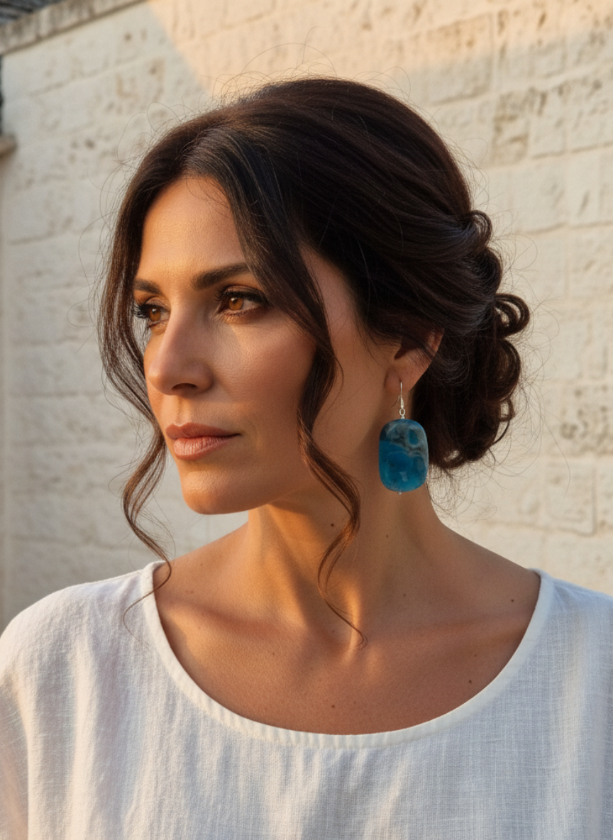 Questi orecchini in agata blu mare sono un pezzo di Puglia da portare con sé, un gioiello che racchiude i colori e i riflessi del Mediterraneo. Pensati per una donna che ama l’eleganza naturale e i pezzi unici, sono perfetti per illuminare il viso con un tocco di colore sofisticato.