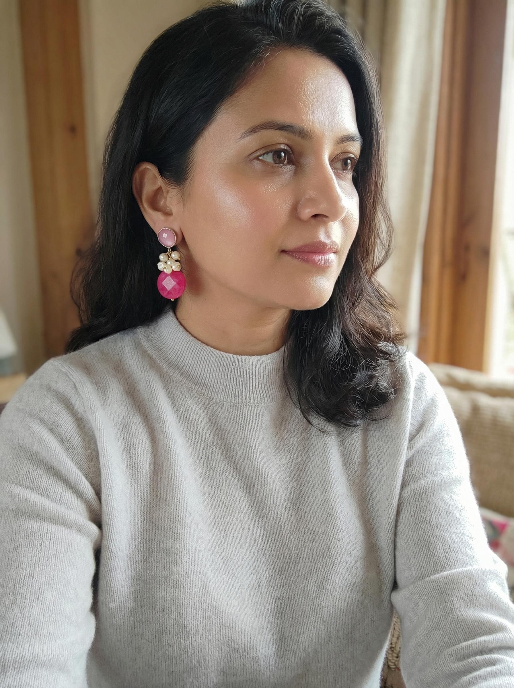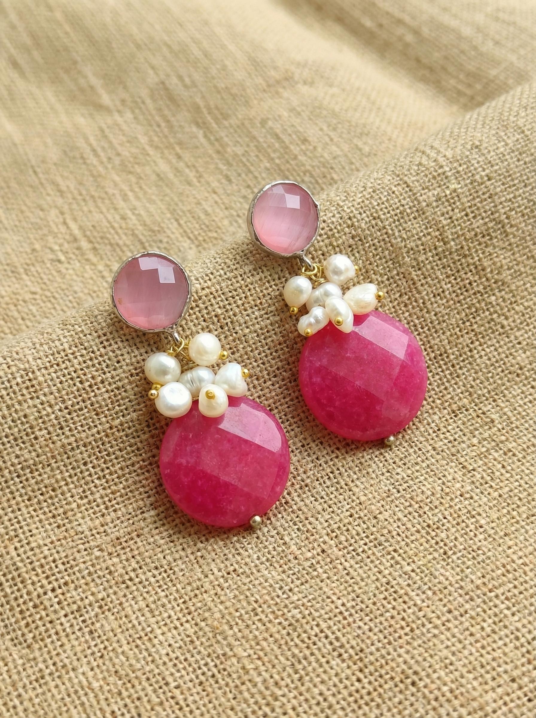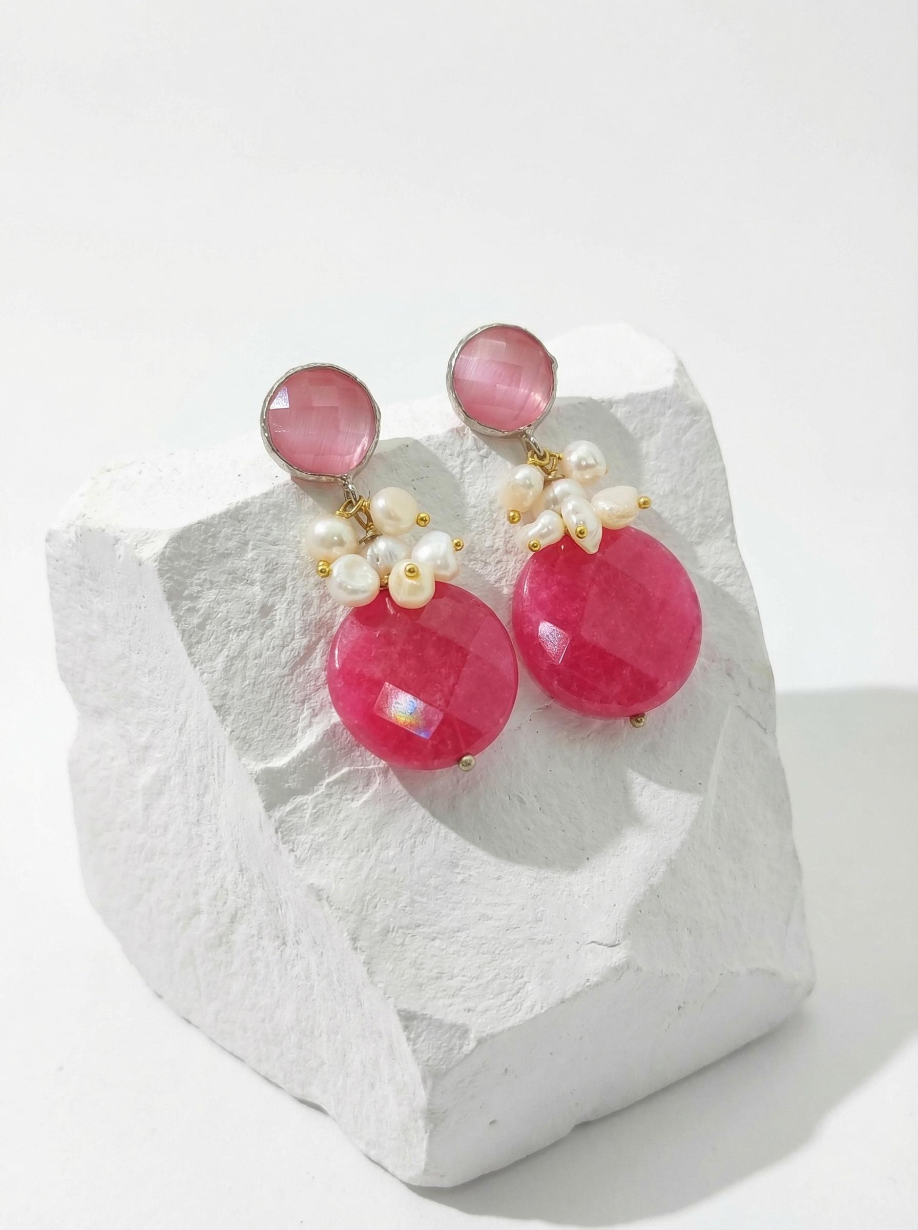 La composizione è ricca e materica: abbiamo abbinato questi orecchini agata fucsia a un centrale di perline di fiume irregolari (scaramazze) che creano un bel contrasto di bianco naturale. La parte superiore in occhio di gatto rosa anticato completa il design con un tocco di luce morbida. Il perno a farfalla garantisce stabilità e comfort per tutto il giorno.