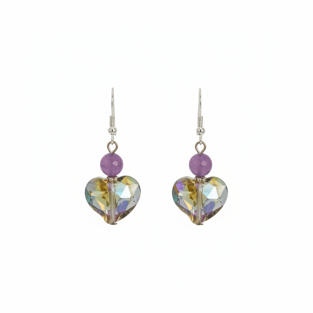 Questi orecchini con ametista e argento 925 sono pensati per chi cerca un gioiello allegro e facile da indossare. La piccola sfera di Ametista viola dà un tocco di colore, mentre il cuore in cristallo sfaccettato cattura la luce ad ogni movimento con i suoi riflessi cangianti. Sono il classico accessorio che illumina il viso e sta bene con tutto, dalla t-shirt al vestitino.