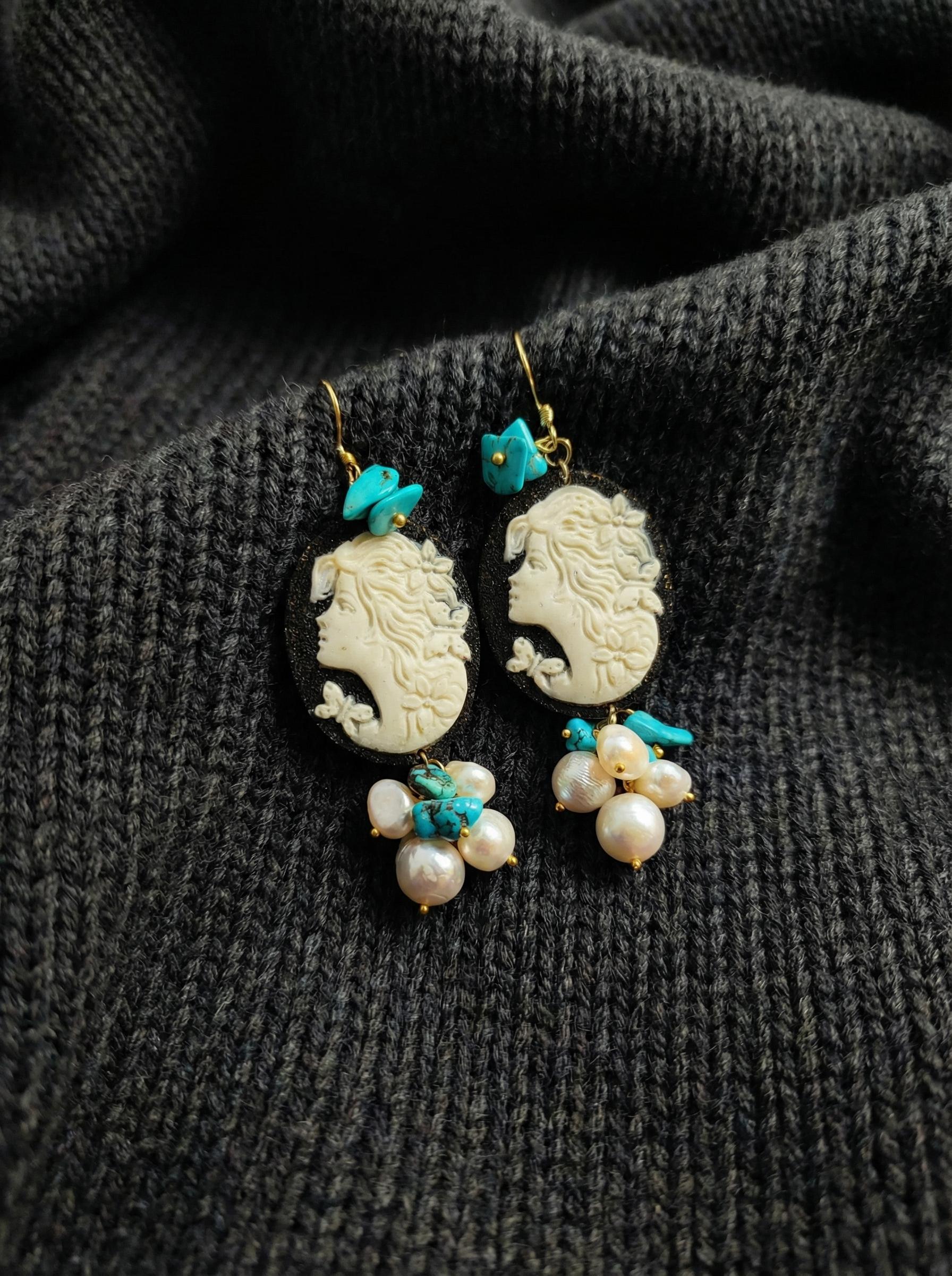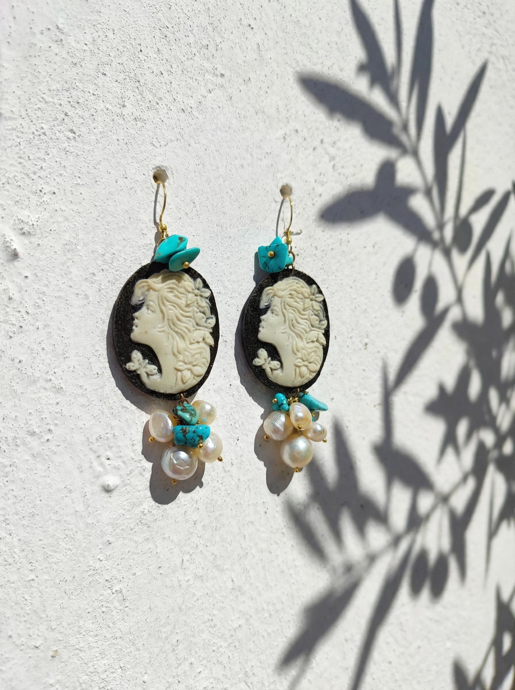 Materiali: Pasta Vulcanica (Cammeo), Perle di Fiume, Turchese, Argento 925 (monachella)