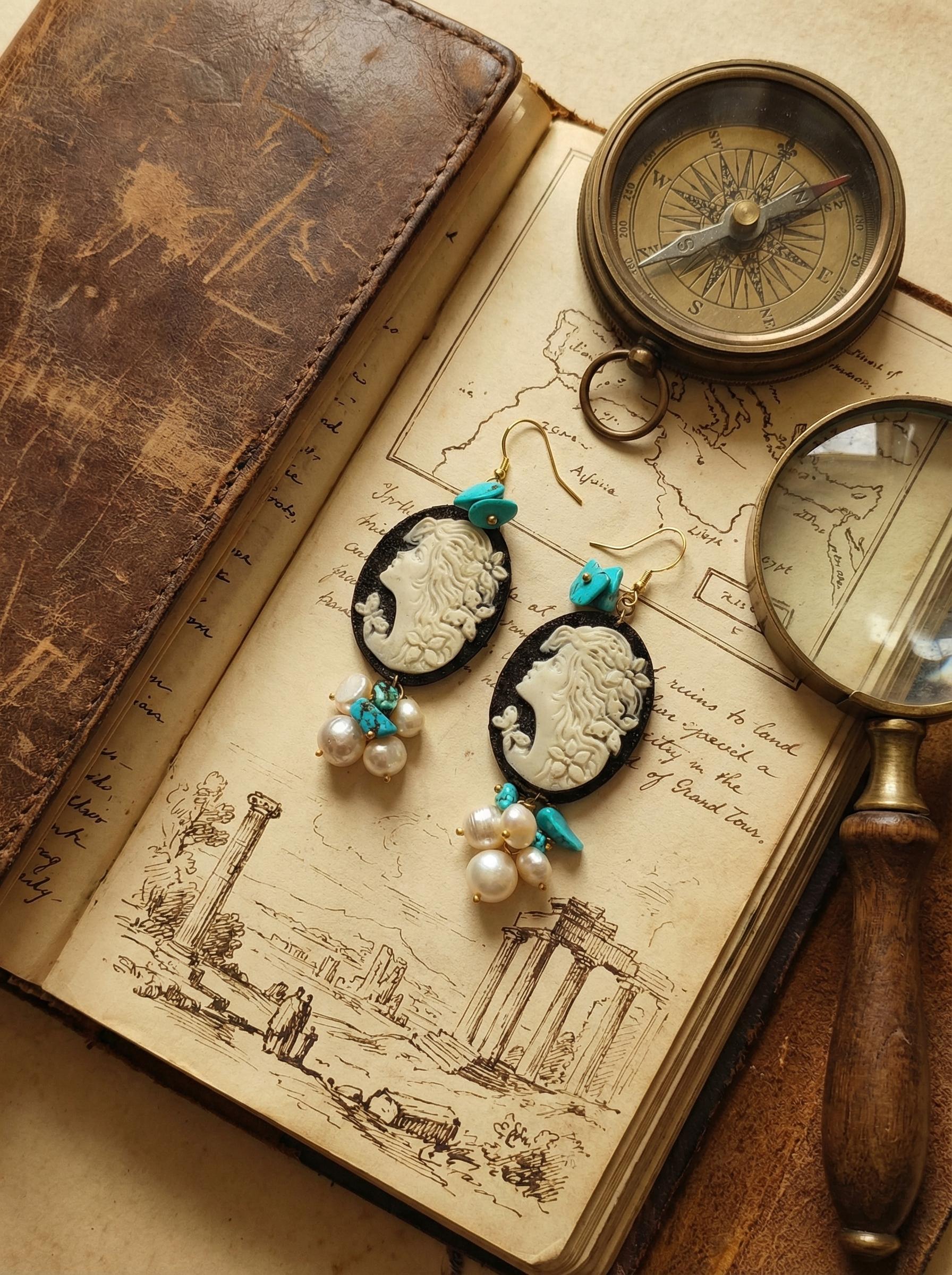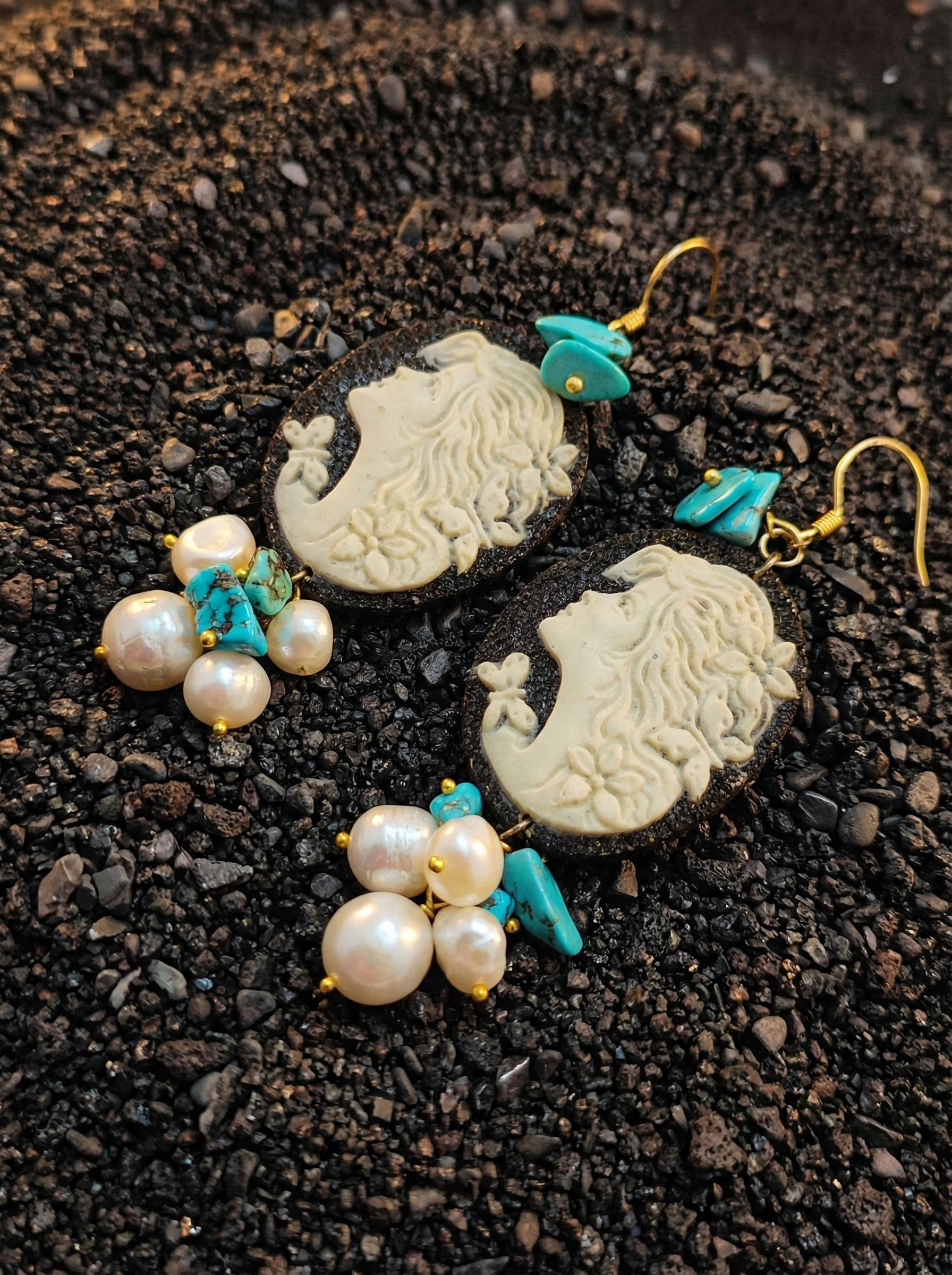 Questi orecchini sono un omaggio alla terra e al fuoco. Il pendente principale è un cammeo ovale in pasta vulcanica nera, su cui risalta un profilo femminile bianco finemente lavorato con dettagli floreali.
