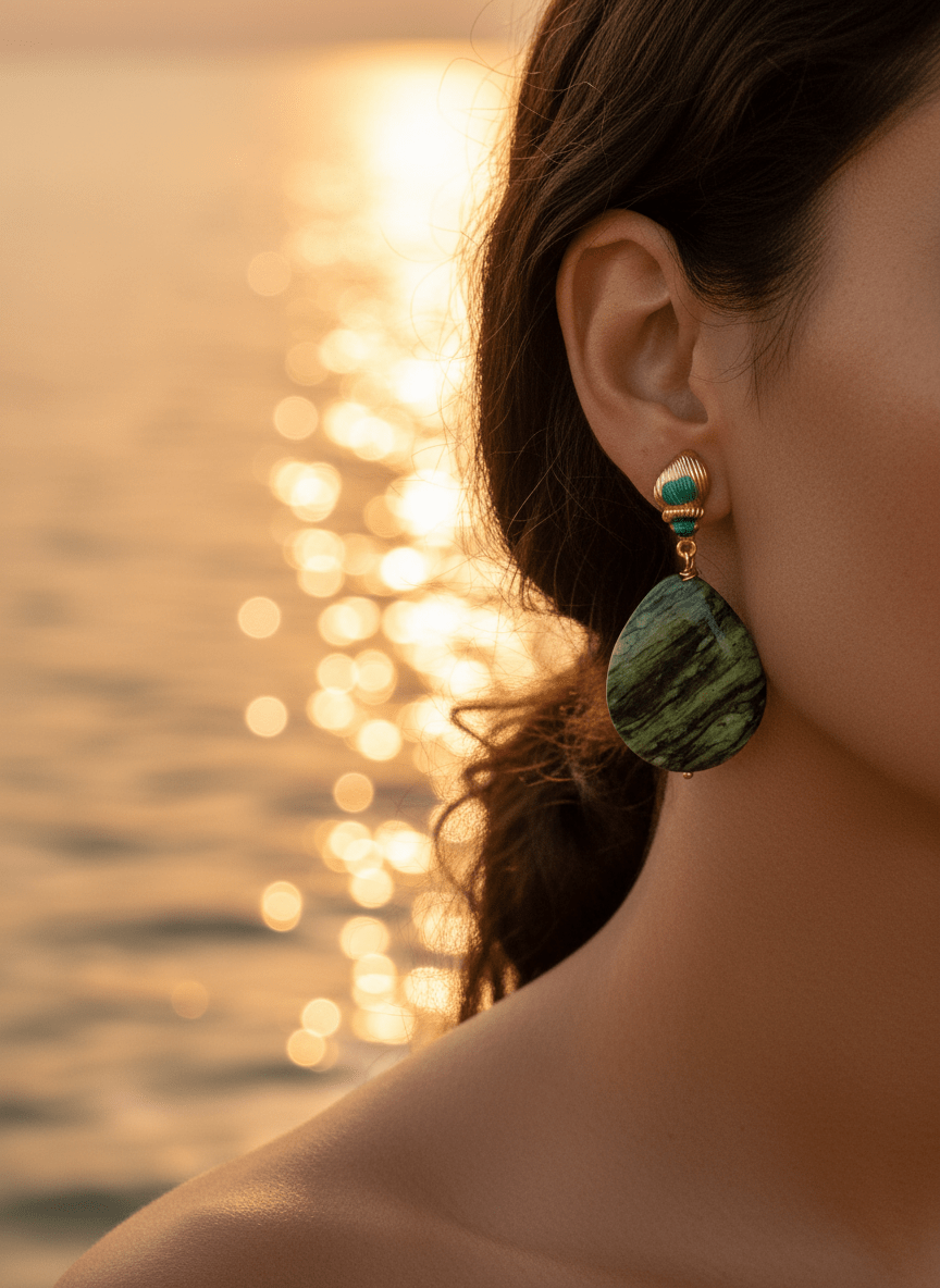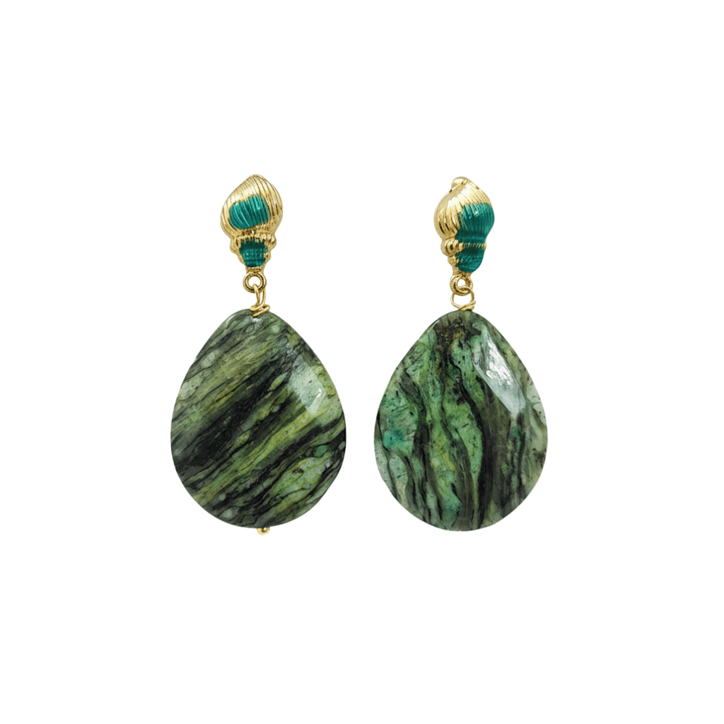 Il richiamo di una caletta nascosta, trasformato in gioiello. I nostri orecchini conchiglia e pietra verde sono un pezzo unico che cattura l’essenza del mare, unendo la forma iconica di una conchiglia dorata alle profonde venature di una pietra naturale.