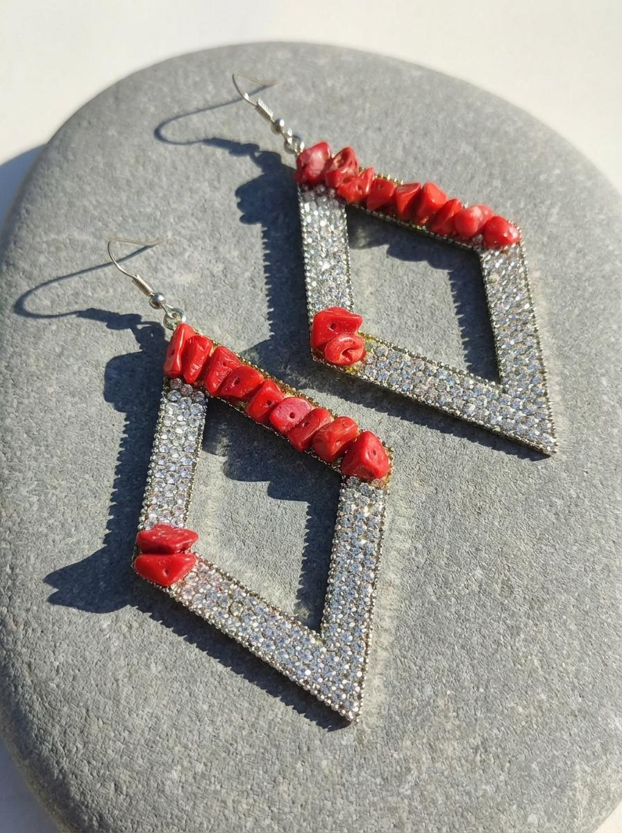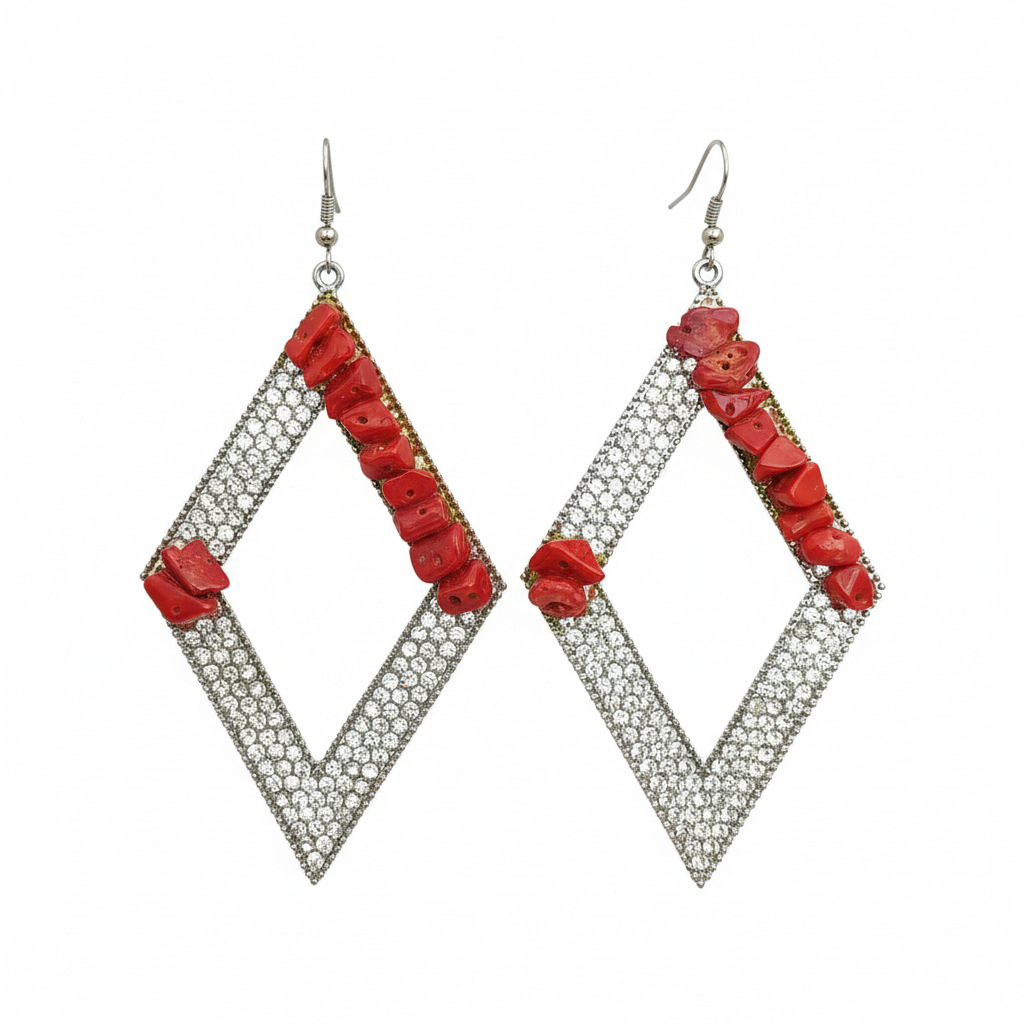 Questi orecchini corallo bambù sono pensati per chi non vuole passare inosservata. La forma geometrica a rombo, interamente ricoperta di zirconi scintillanti, crea un contrasto audace e moderno con i frammenti irregolari di corallo rosso applicati sui lati.