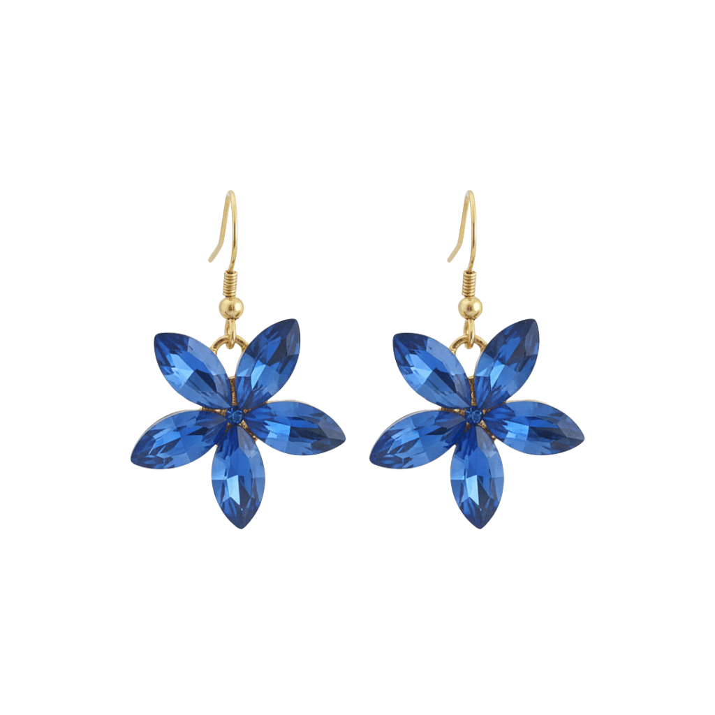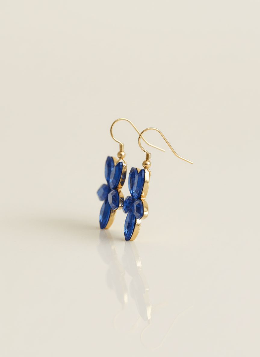 Questi orecchini fiore blu sono un inno alla delicatezza. Ho scelto un cristallo blu intenso, tagliato e sfaccettato per formare i petali di un fiore stilizzato, che ricorda un non-ti-scordar-di-me. La lavorazione del cristallo permette di creare un gioco di riflessi che rende il gioiello vivo e scintillante.