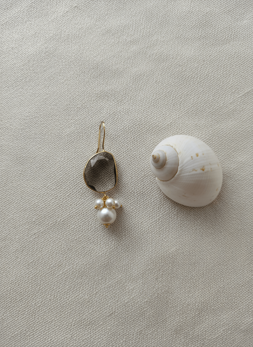 Un’elegante unione di mistero e luce. Questi orecchini grigio fumo uniscono un grande cristallo sfaccettato a un delicato grappolo di perle, per un’eleganza sofisticata e senza tempo.