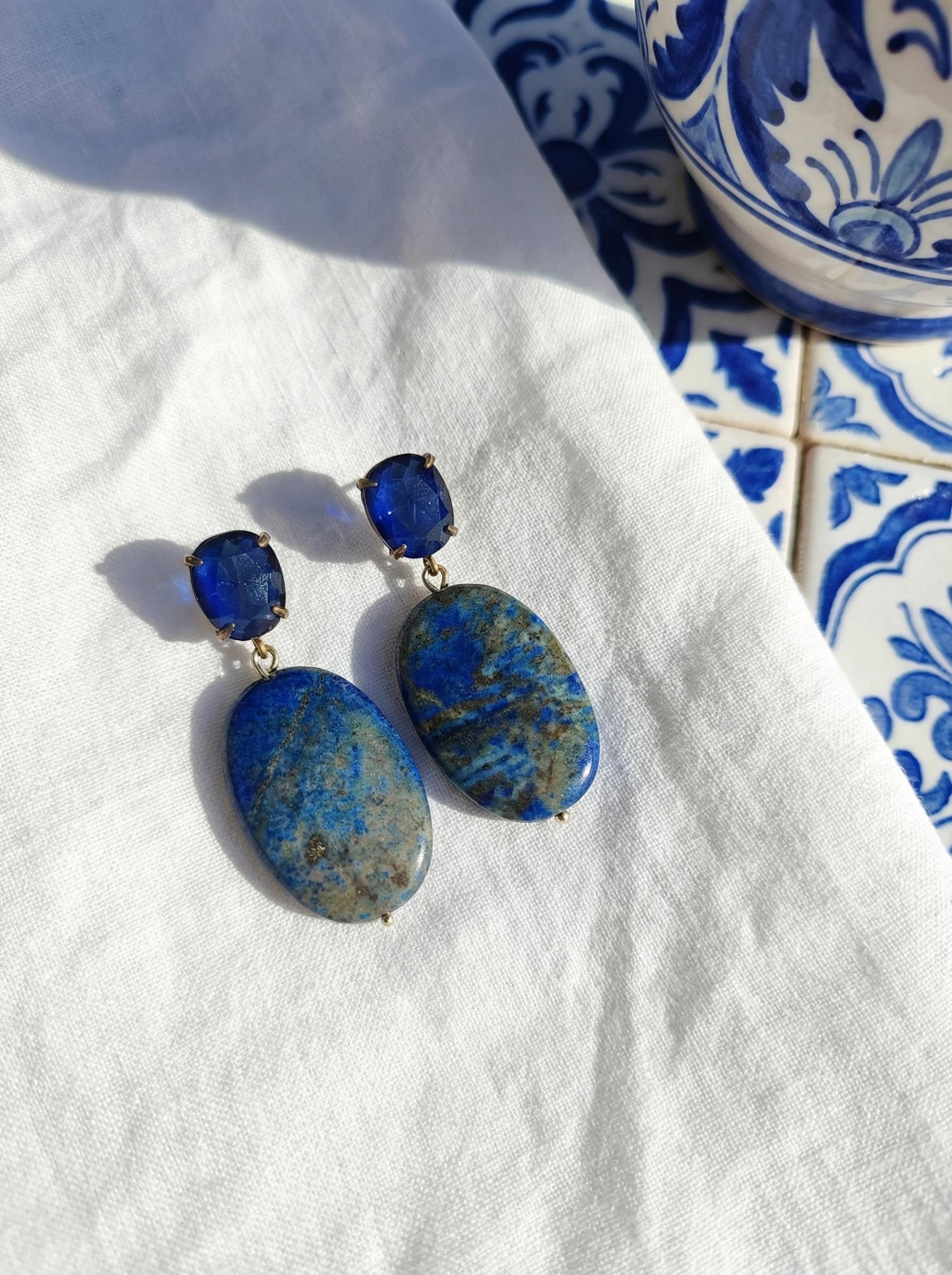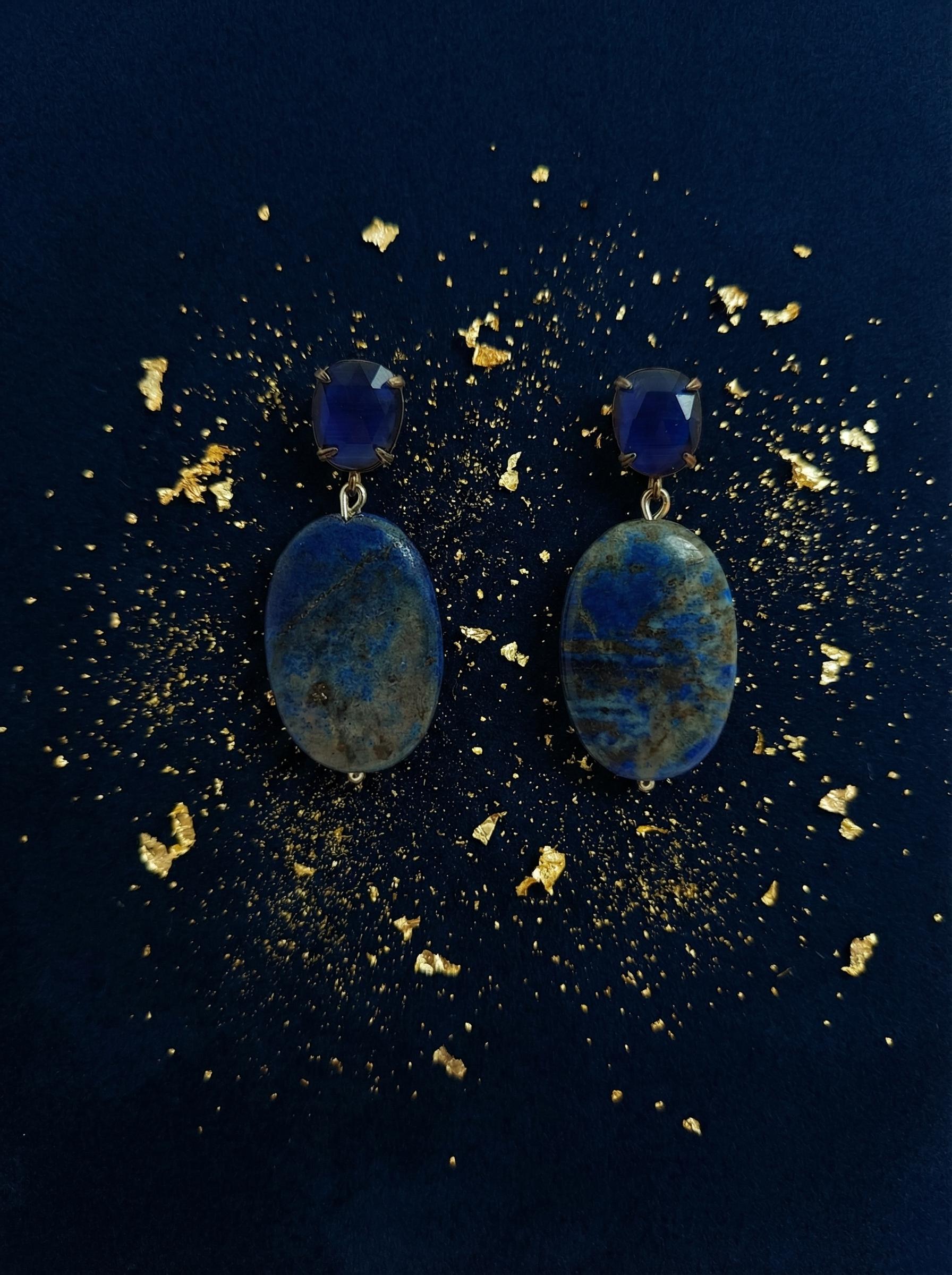 Questi orecchini lapislazzuli sono per chi cerca l’autenticità. La pietra ovale non è una resina uniforme: è vero Lapis, con quelle venature grigie e dorate che raccontano la sua formazione geologica. Nessuna pietra è uguale all’altra.