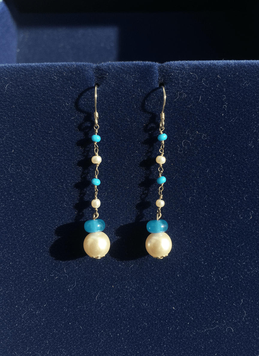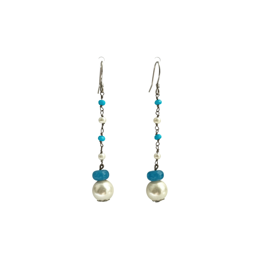 La composizione, montata su una catenina in metallo argentato, alterna piccole perline di madreperla a frammenti di turchese. Il pendente finale combina una pietra di agata azzurra con una perla in madreperla più grande, creando un delicato punto focale. Leggerissimi e versatili, questi orecchini lunghi turchese sono l’accessorio ideale per aggiungere un dettaglio chic al tuo look di ogni giorno.