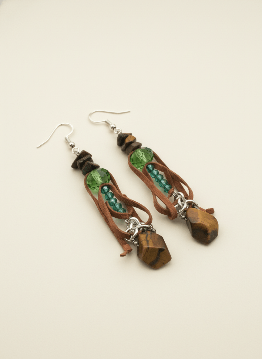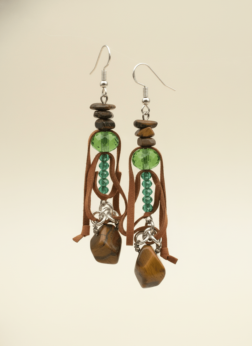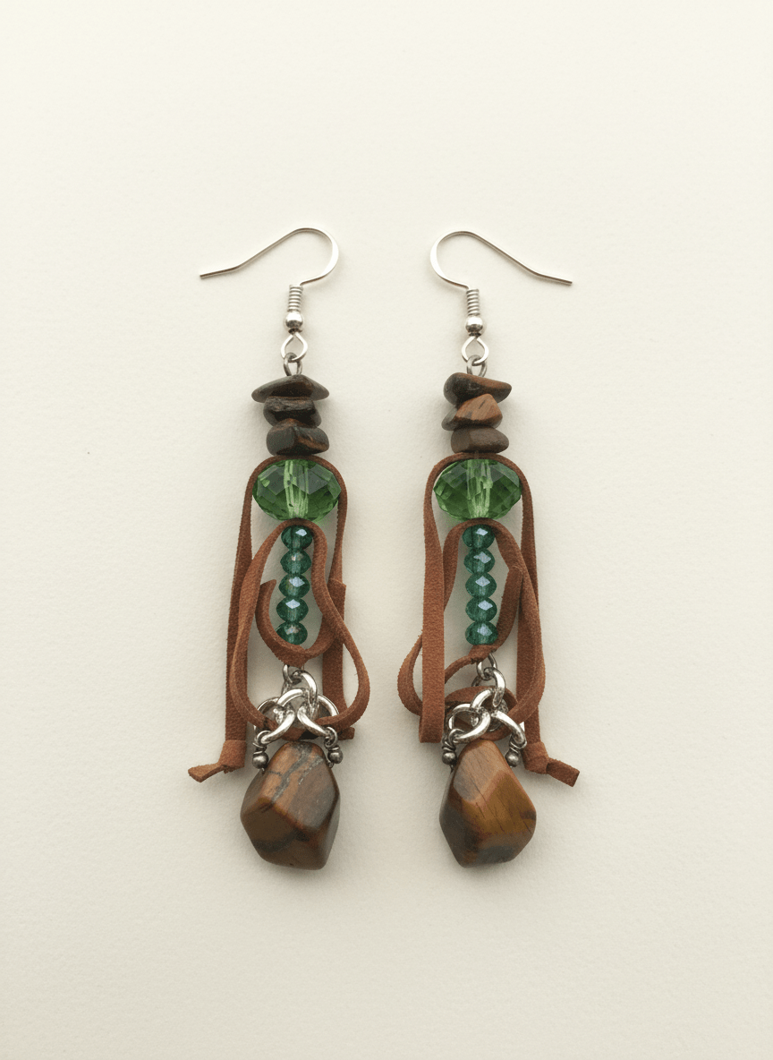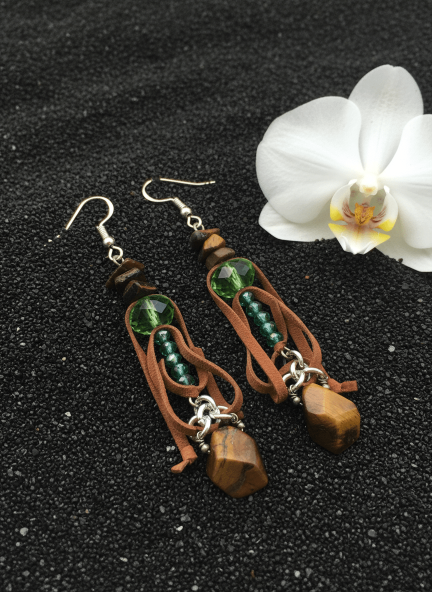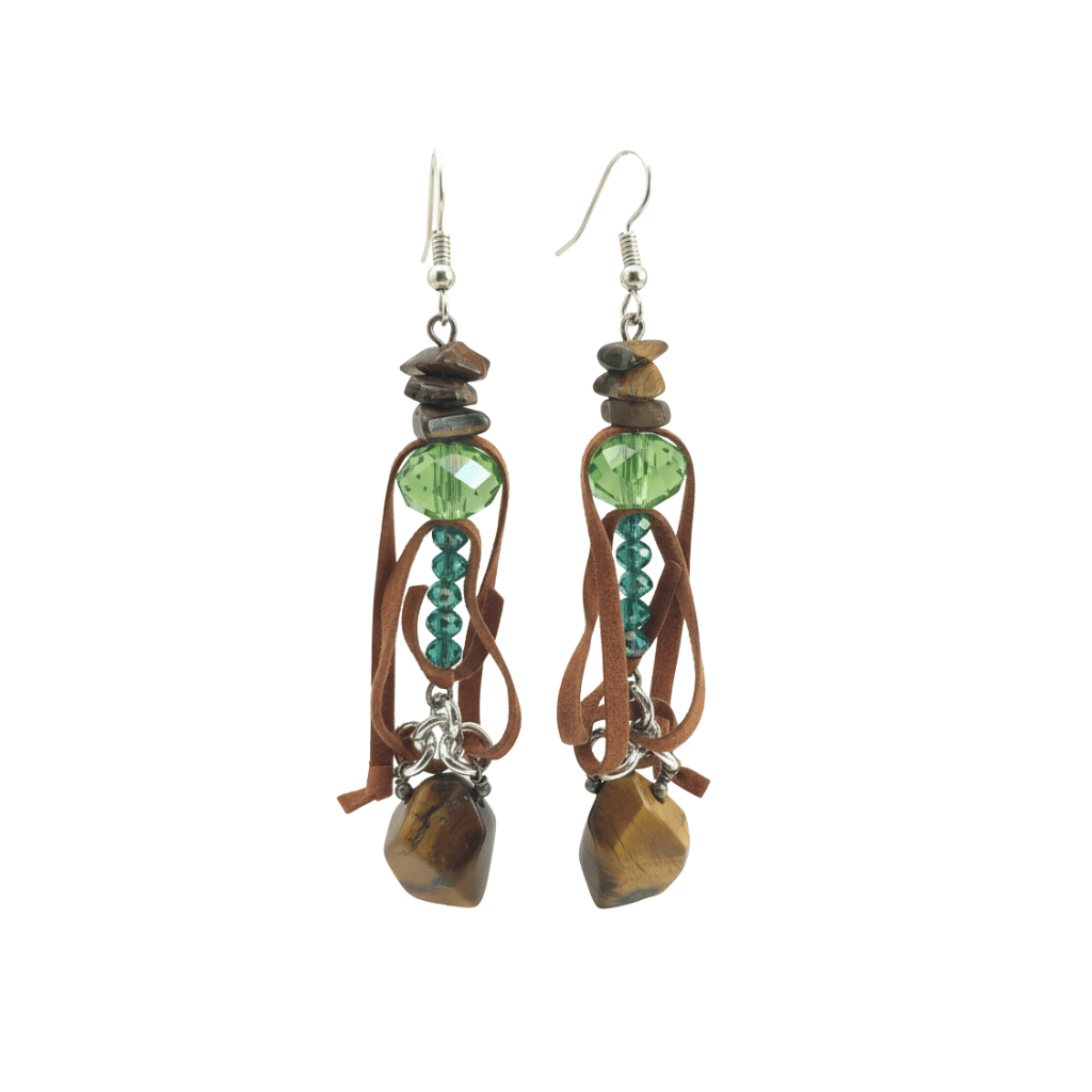 Il design pendente è una cascata di elementi materici: una goccia in pelle fa da base a splendide pietre naturali di Occhio di Tigre, con le loro tipiche venature dorate e cangianti. A illuminare la composizione, un mix di cristalli verdi aggiunge un tocco di colore inaspettato, come la vegetazione lussureggiante di un’isola. La monachella in argento garantisce qualità e comfort. Indossare questi orecchini occhio di tigre è un’affermazione di stile, un modo per portare con sé un pezzo di artigianato originale e pieno di personalità.