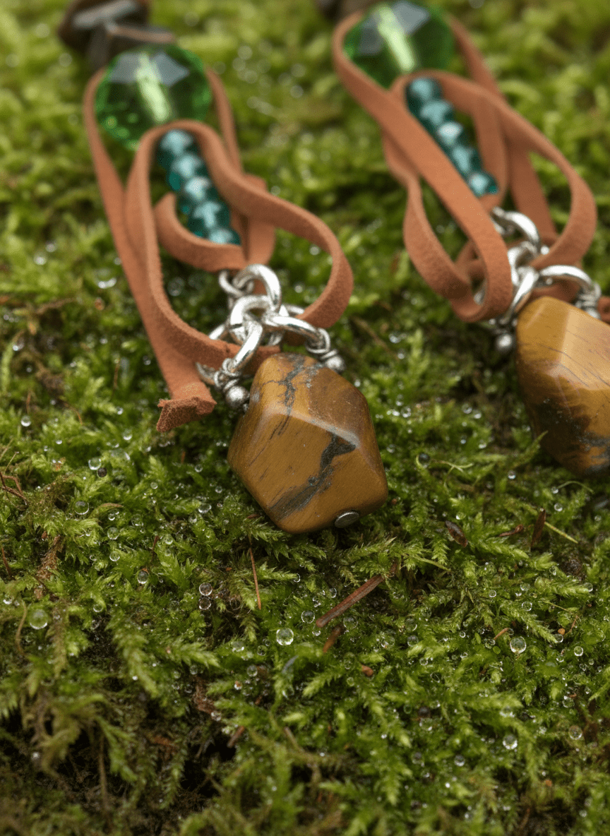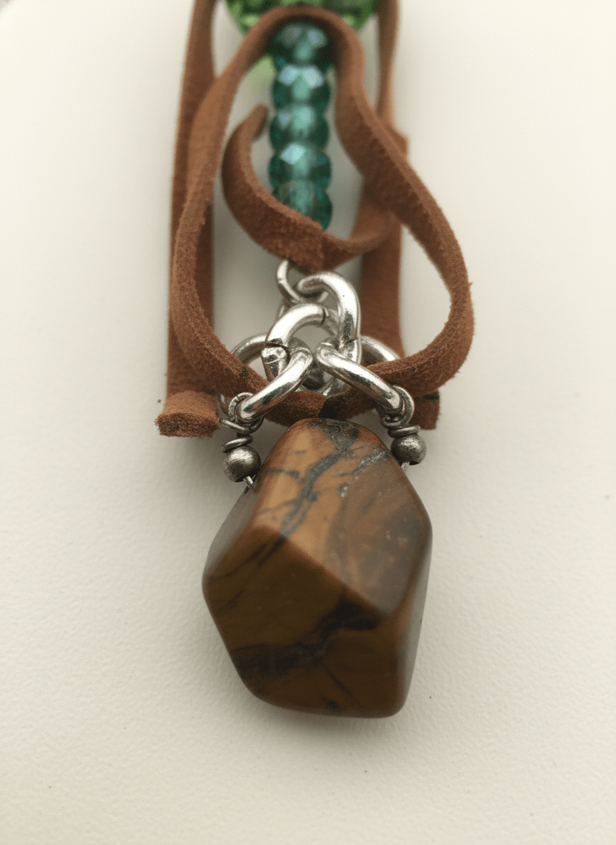 Materiali: Pelle, pietre naturali di Occhio di Tigre, Cristalli verdi mix.