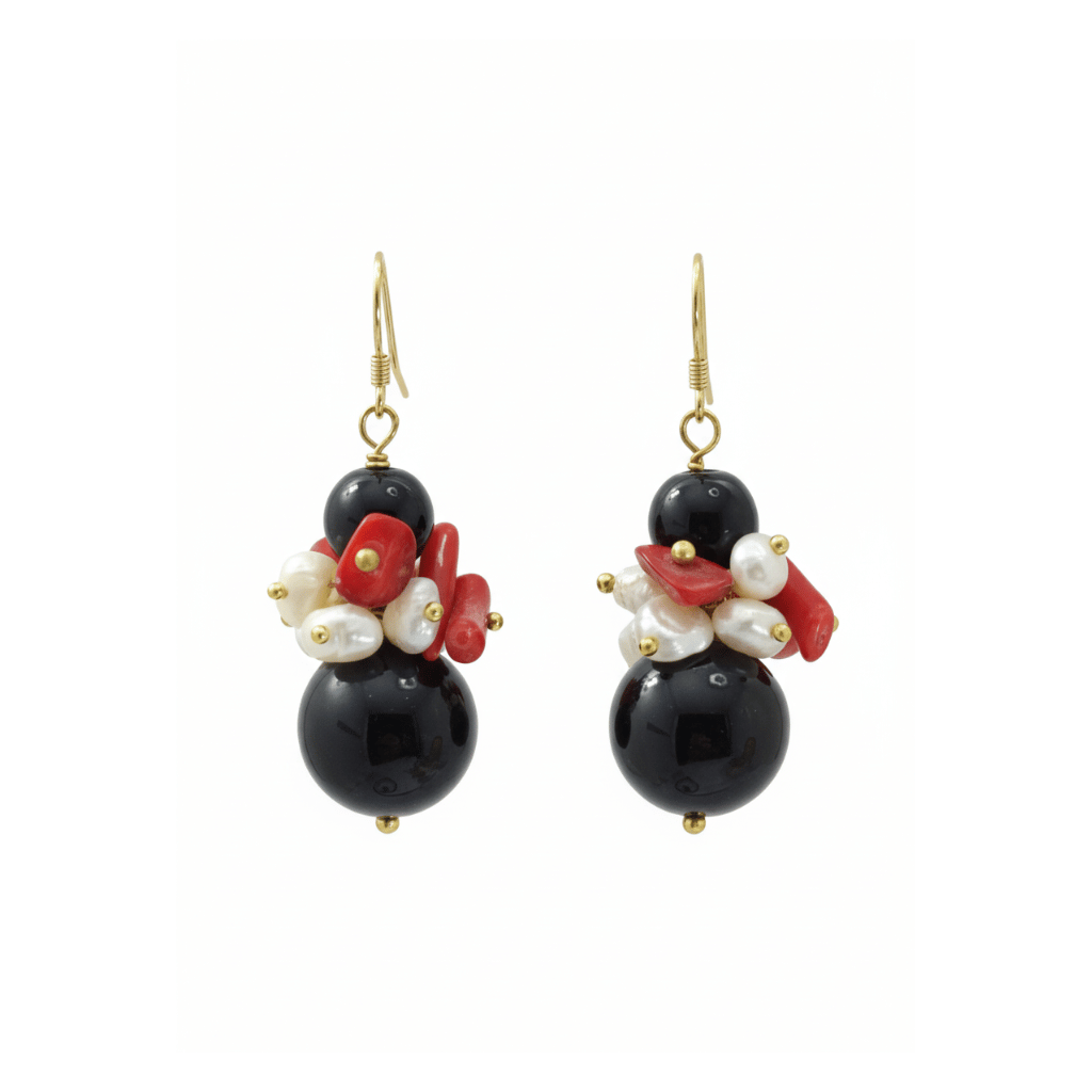 Orecchini Onice Nero, Corallo Rosso e Perle