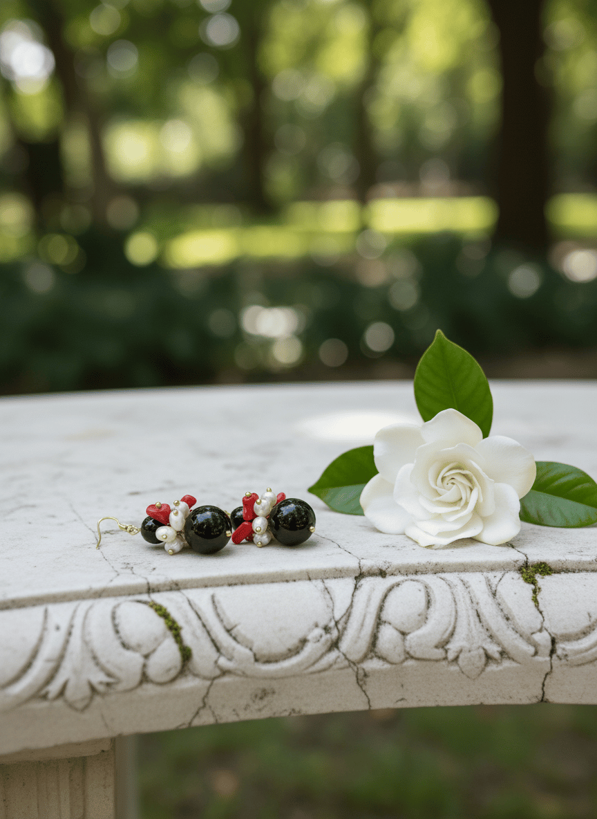 In questi orecchini onice e corallo ho voluto catturare un’eleganza decisa e passionale. Il design gioca sull’accostamento di tre elementi iconici: la profondità dell’onice nero, la vitalità del corallo rosso e la purezza delle perle di fiume. La composizione a grappolo è un piccolo bouquet di gemme, assemblato a mano per creare un equilibrio perfetto.