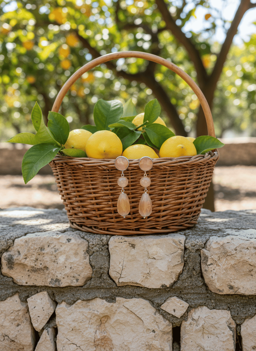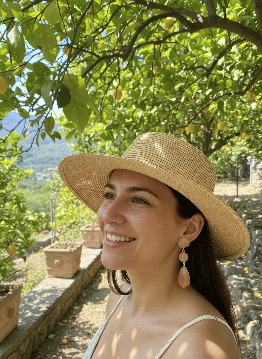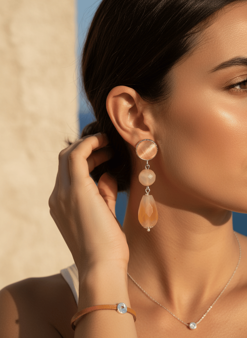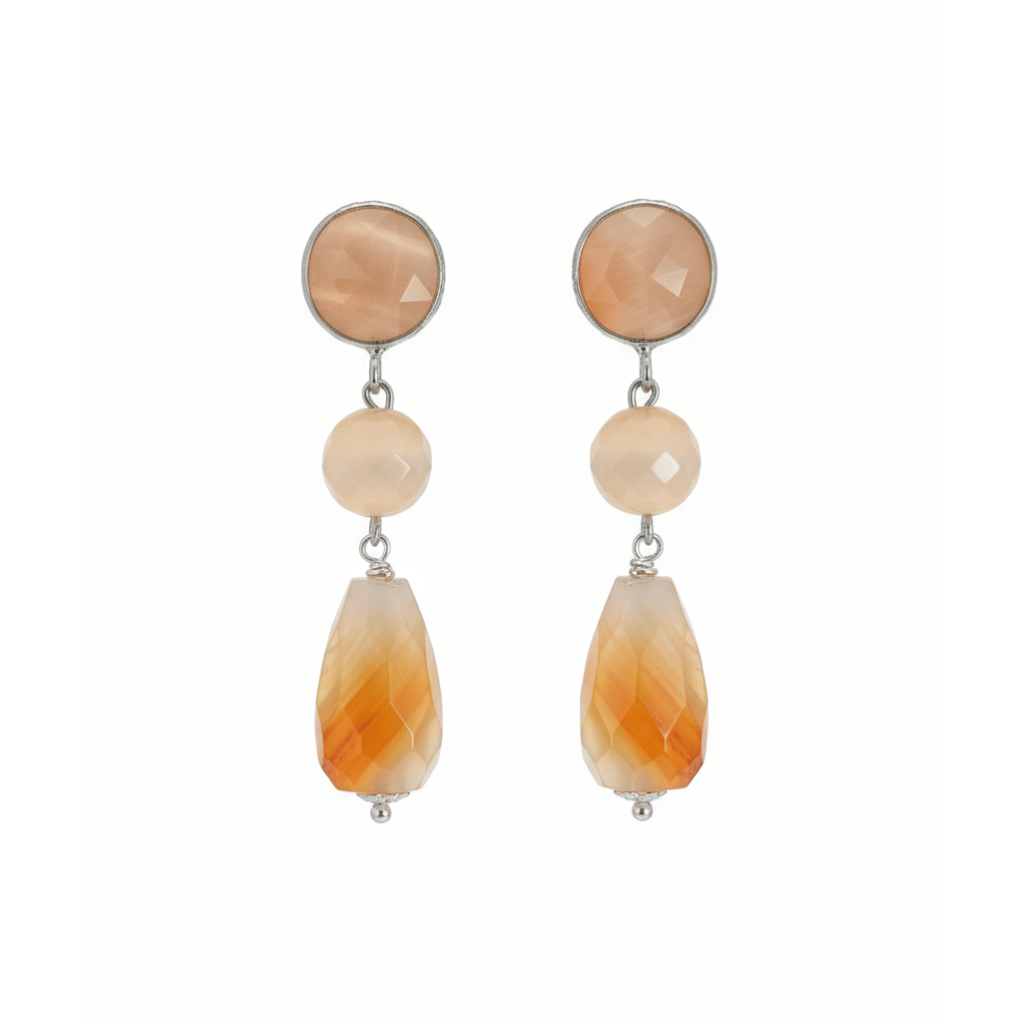 I colori caldi di un tramonto caprese. Questi orecchini pendenti agata sono un gioiello elegante e luminoso, una cascata di tre pietre nelle delicate sfumature del beige e dell’arancio chiaro per un tocco di classe mediterranea.