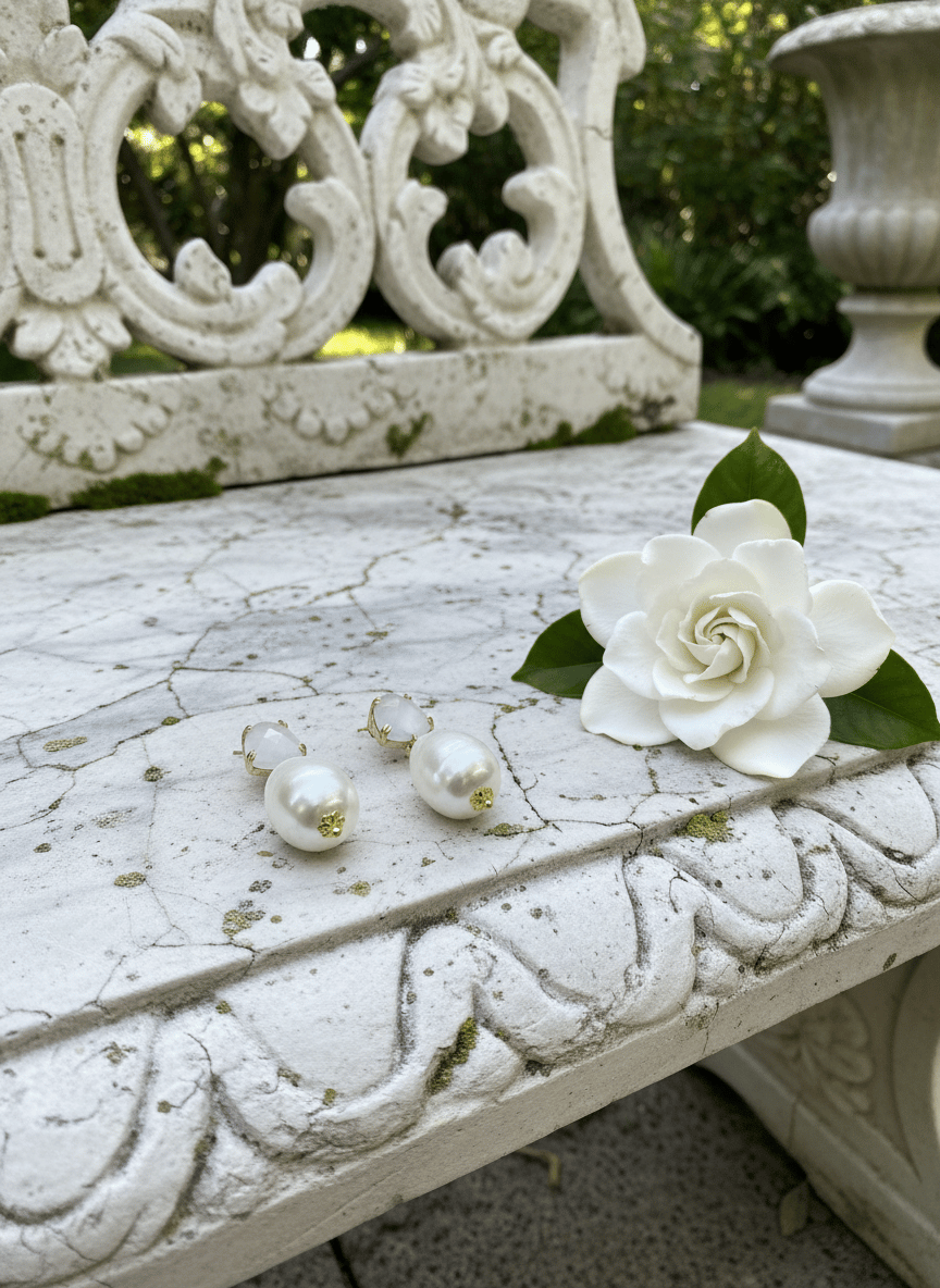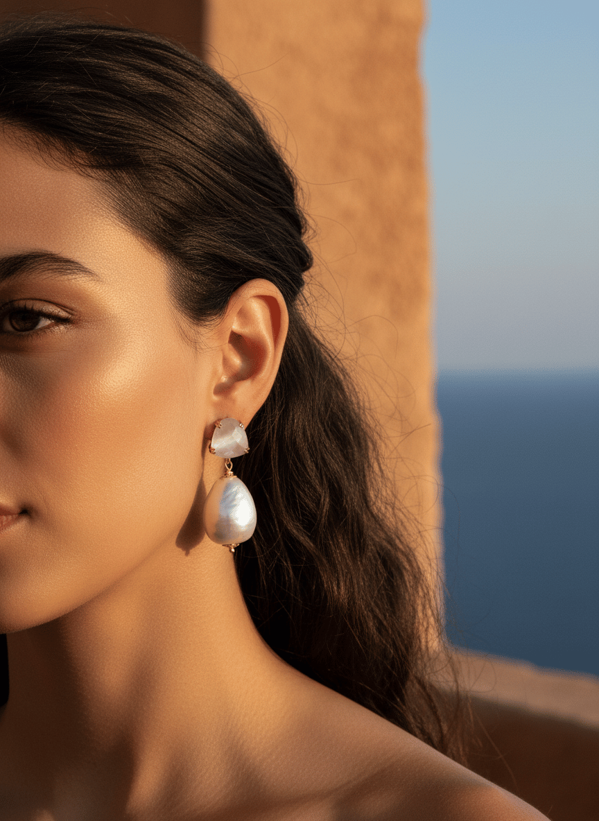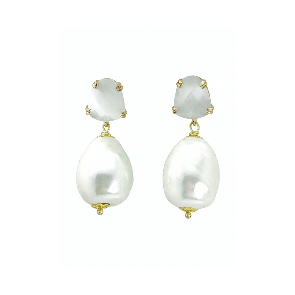 I nostri orecchini perle barocche e cristallo sono ispirati alla luce magica dell’aurora. Ogni elemento è scelto per creare un gioco di riflessi unico: il perno è un cabochon ovale di cristallo occhio di gatto bianco, una pietra nota per il suo affascinante effetto di gatteggiamento, una linea di luce che si muove sulla superficie come una pupilla felina. Questa base luminosa e misteriosa introduce il vero cuore del gioiello.