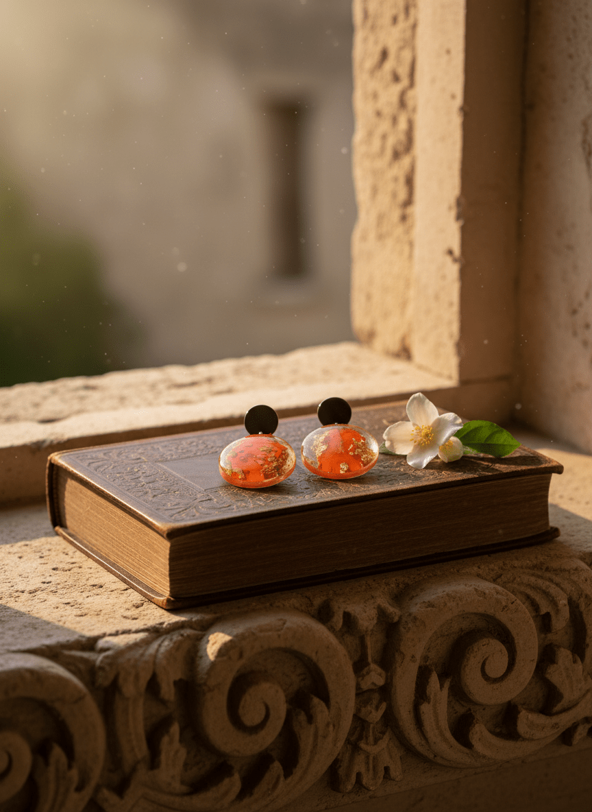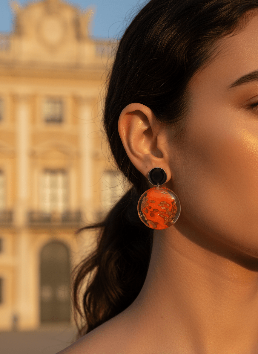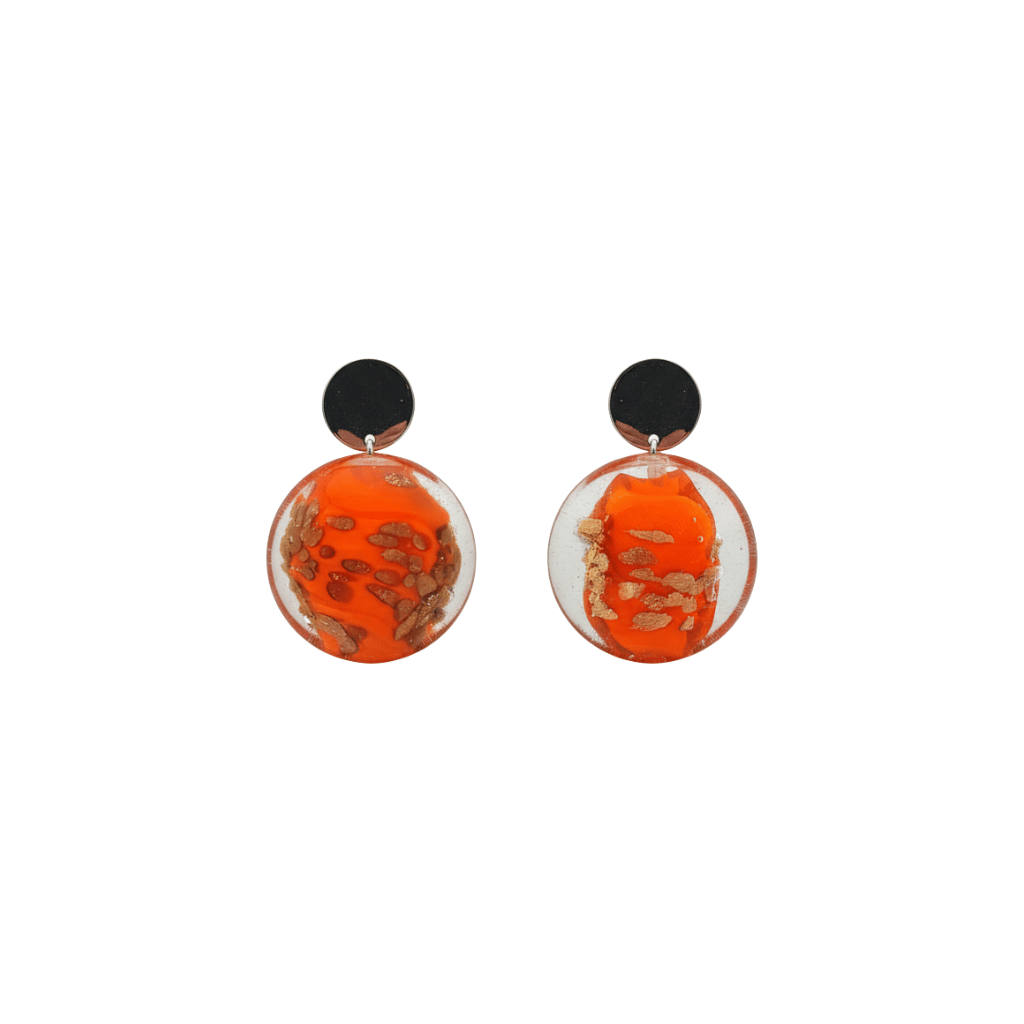 Il design gioca su un contrasto cromatico e materico di grande effetto: il protagonista è il grande disco rotondo in autentico Vetro di Murano. Al suo interno, un’anima di un vibrante color arancione è impreziosita da frammenti di foglia d’oro, creando una profondità e una luminosità uniche. A fare da contrappunto, un perno a disco liscio e nero crea un look moderno e grafico. L’asimmetria naturale delle venature dorate testimonia la natura artigianale di questi splendidi orecchini in vetro di Murano.