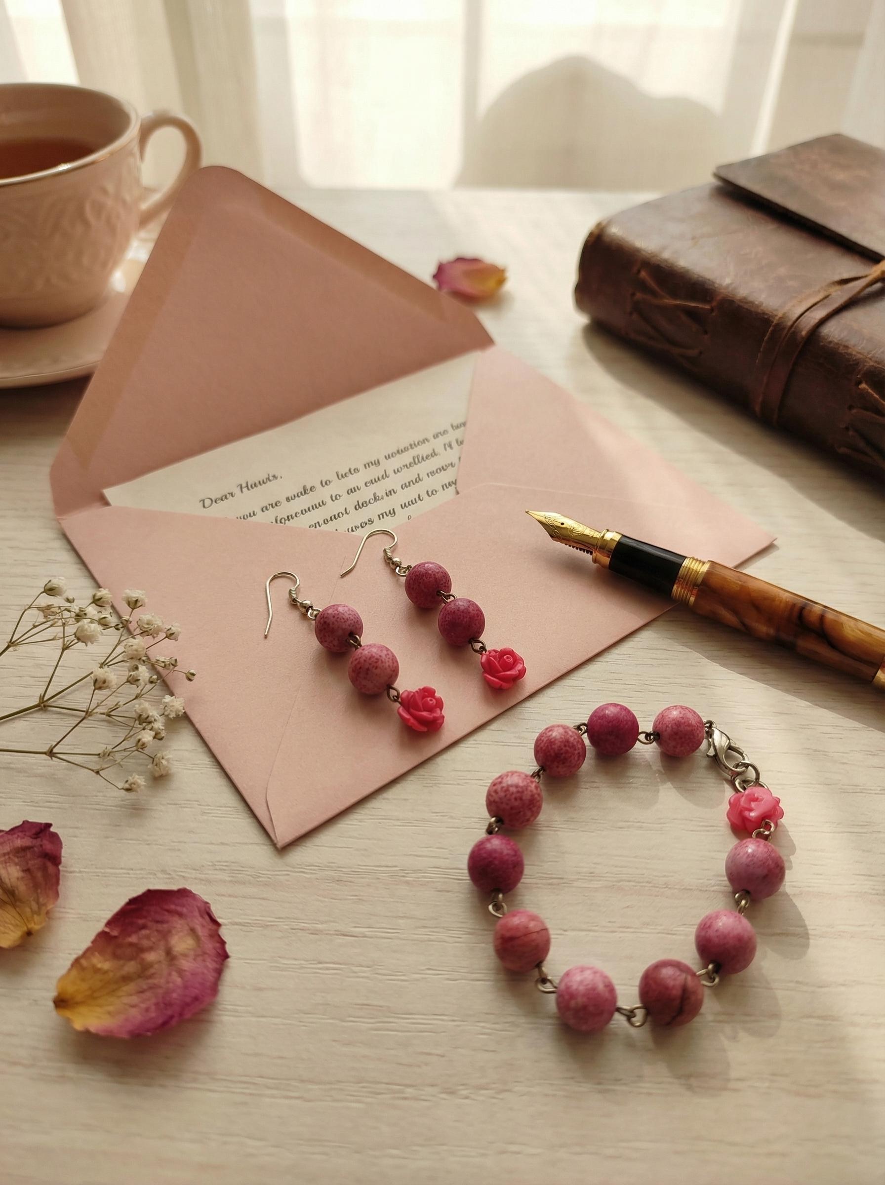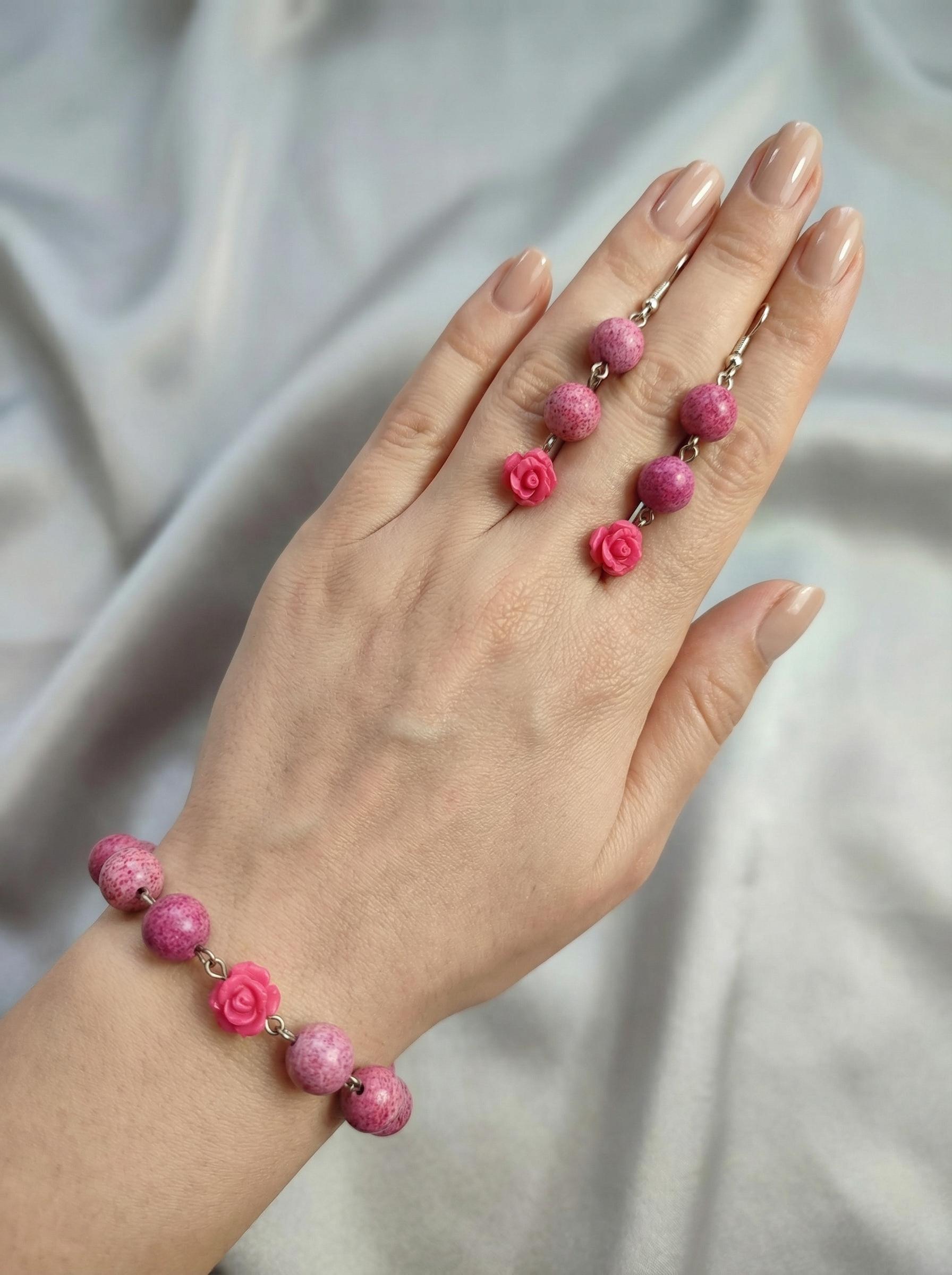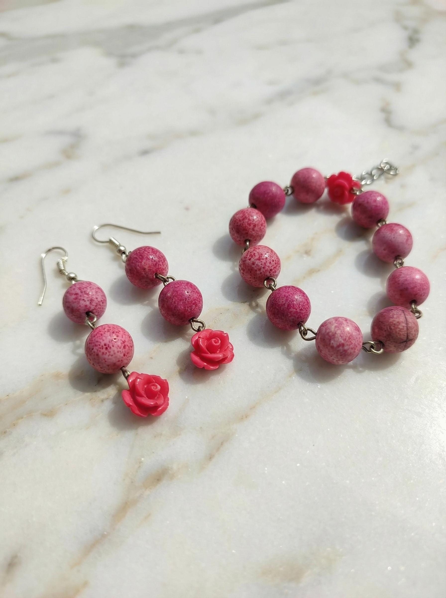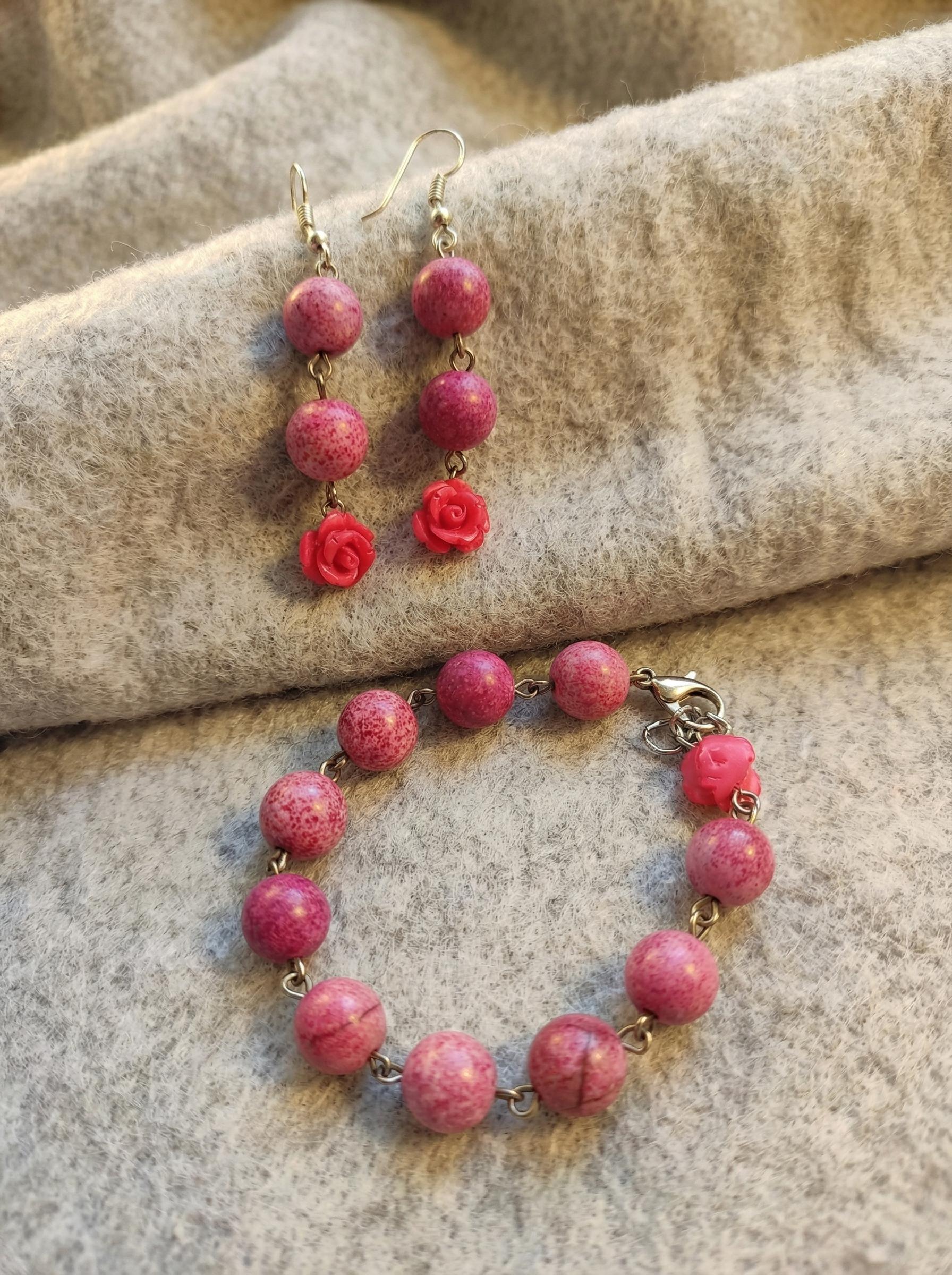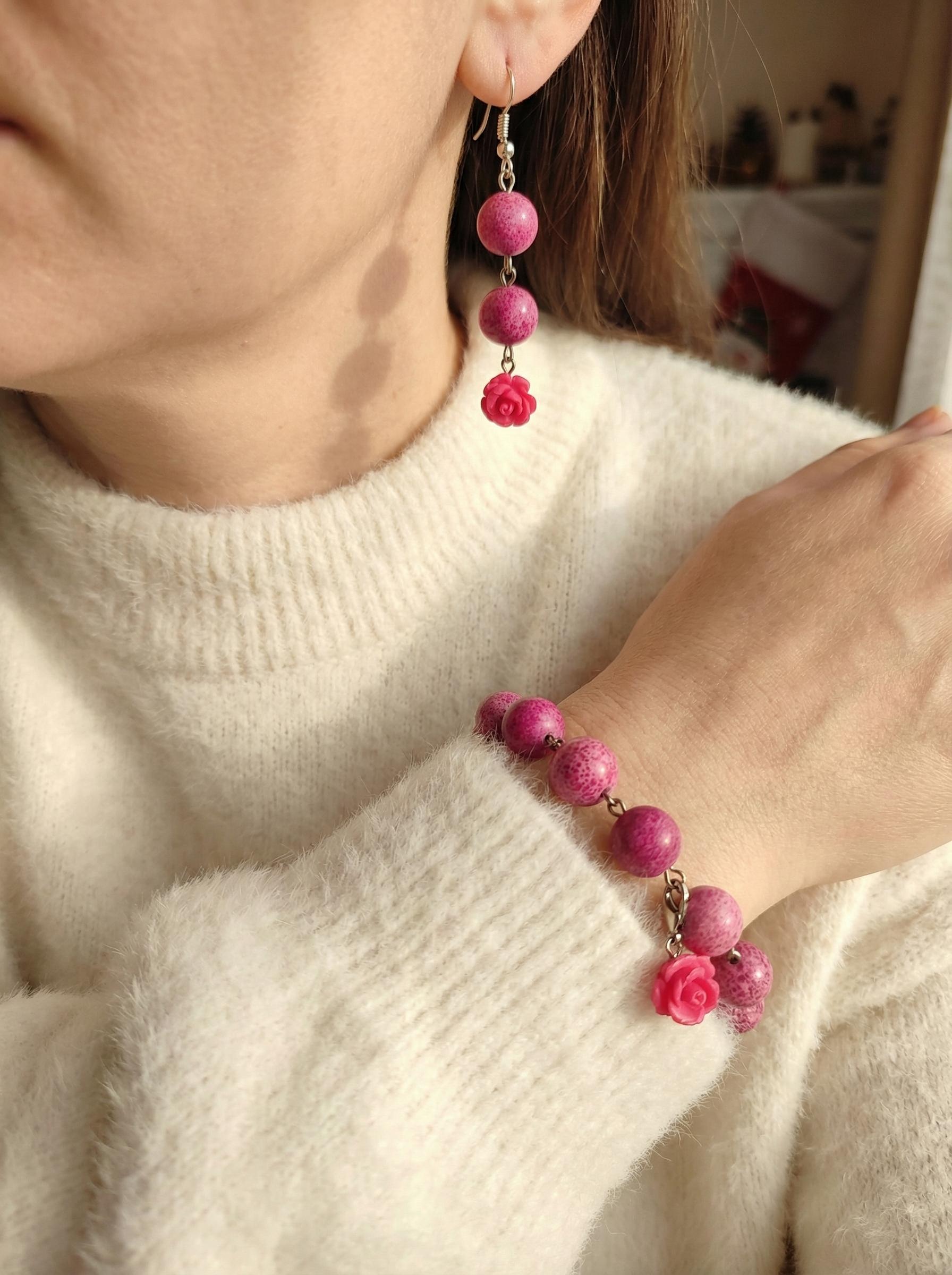 Il tocco in più sono le roselline in resina tono su tono, che trasformano un semplice filo di pietre in un accessorio romantico e femminile. Il bracciale ha una chiusura a moschettone pratica, e gli orecchini sono lunghi il giusto (6 cm) per illuminare il collo senza pesare (solo 7 gr).